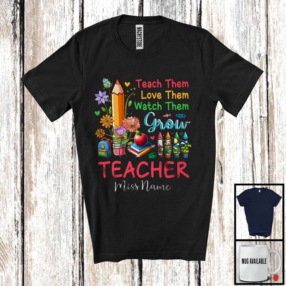 Personalized Custom Name Teacher Teach Love Watch Them Grow, Lovely Flowers Pencils Group T-Shirt