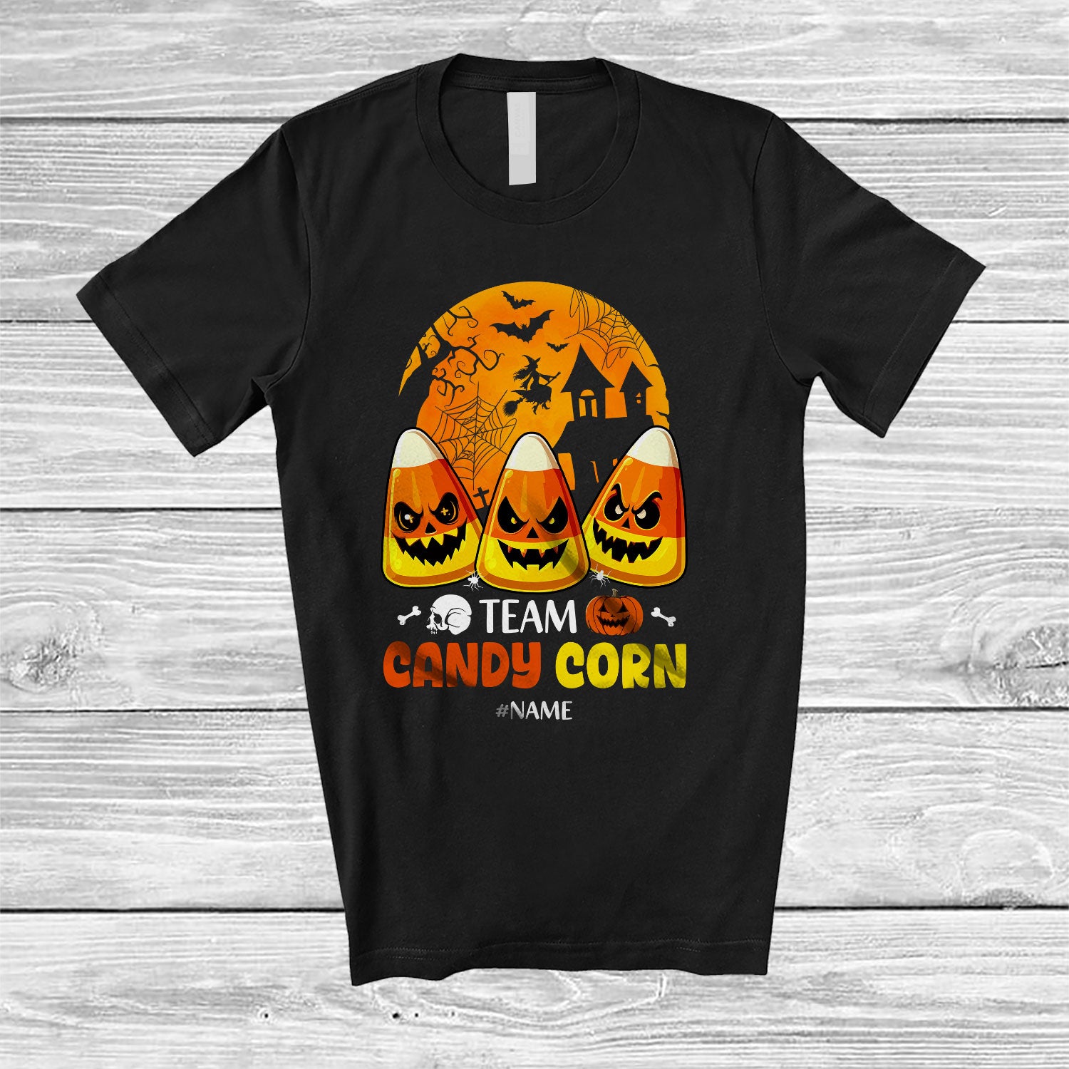 Personalized Custom Name Team Candy Corn; Scary Halloween Moon Three Candy Corn; Family T-Shirt. This cotton t-shirt is a durable staple product with a classic fit. One of the most popular items, it has a relaxed style made for everyday and casual wear.