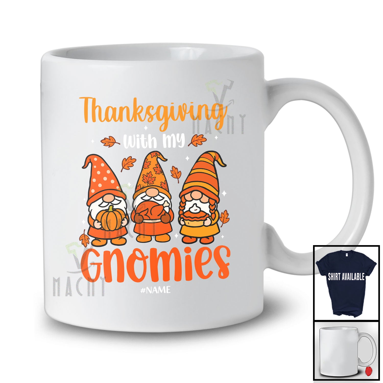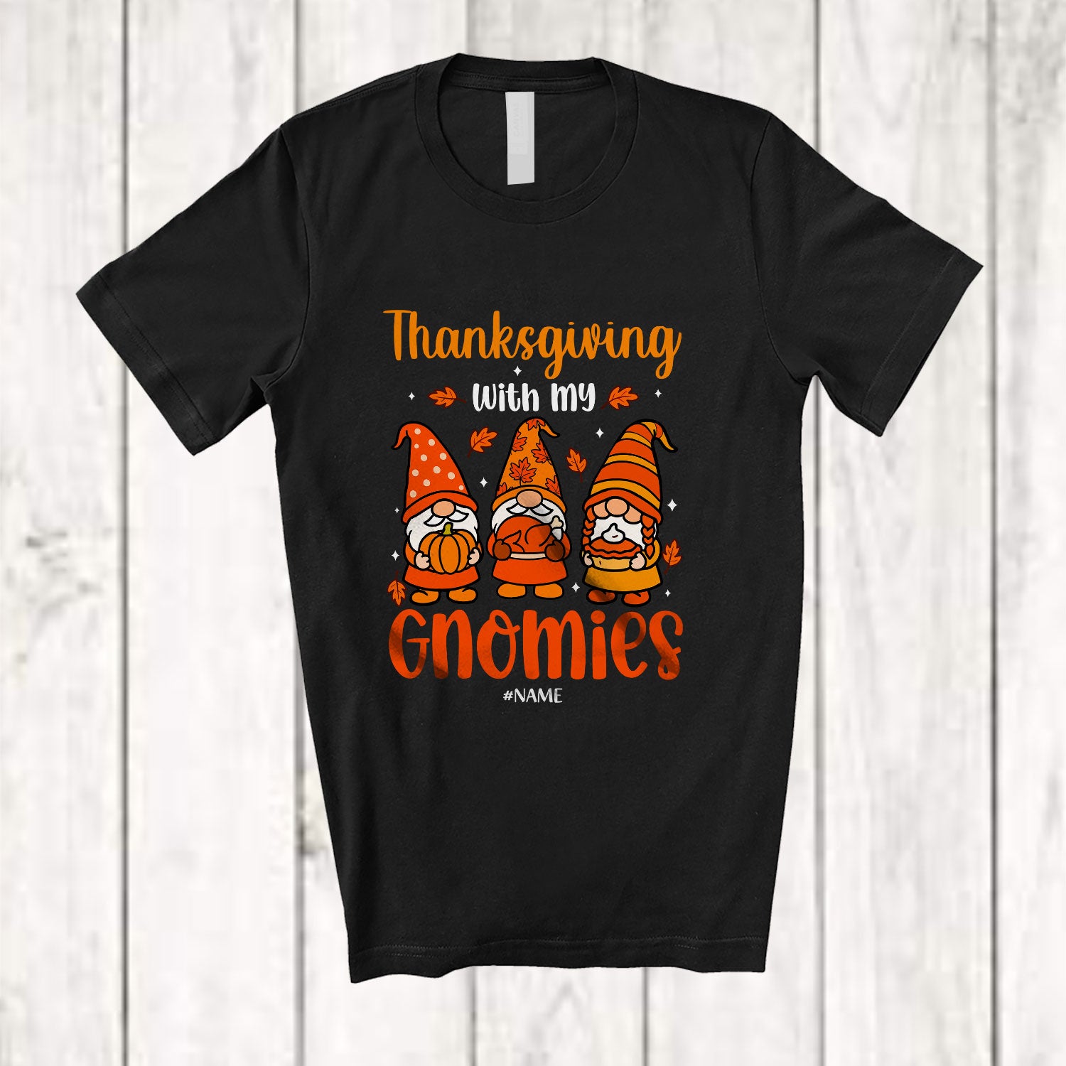 Personalized Custom Name Thanksgiving With My Gnomies; Joyful Three Fall Autumn Gnomes T-Shirt. This cotton t-shirt is a durable staple product with a classic fit. One of the most popular items, it has a relaxed style made for everyday and casual wear.