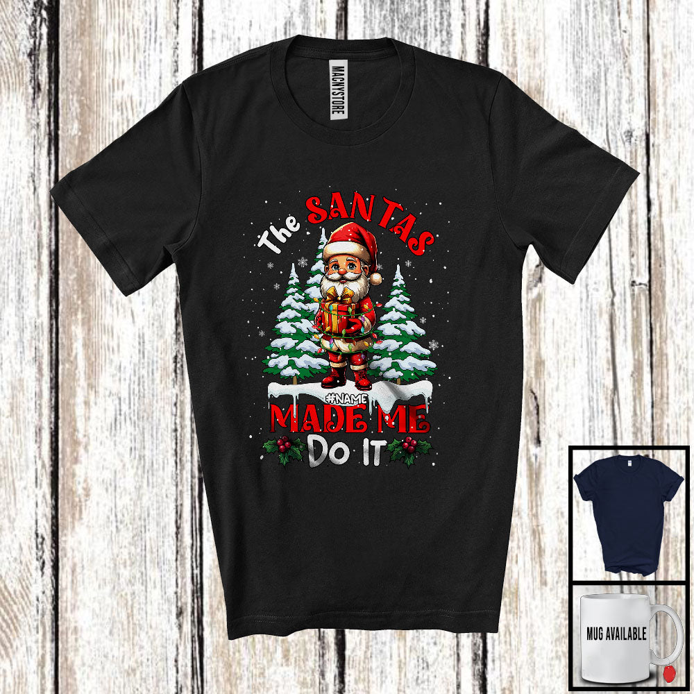 Personalized Custom Name The Santas Made Me Do It; Joyful Christmas Tree Naughty Santa; Family T-Shirt. This cotton t-shirt is a durable staple product with a classic fit. One of the most popular items, it has a relaxed style made for everyday and casual wear.