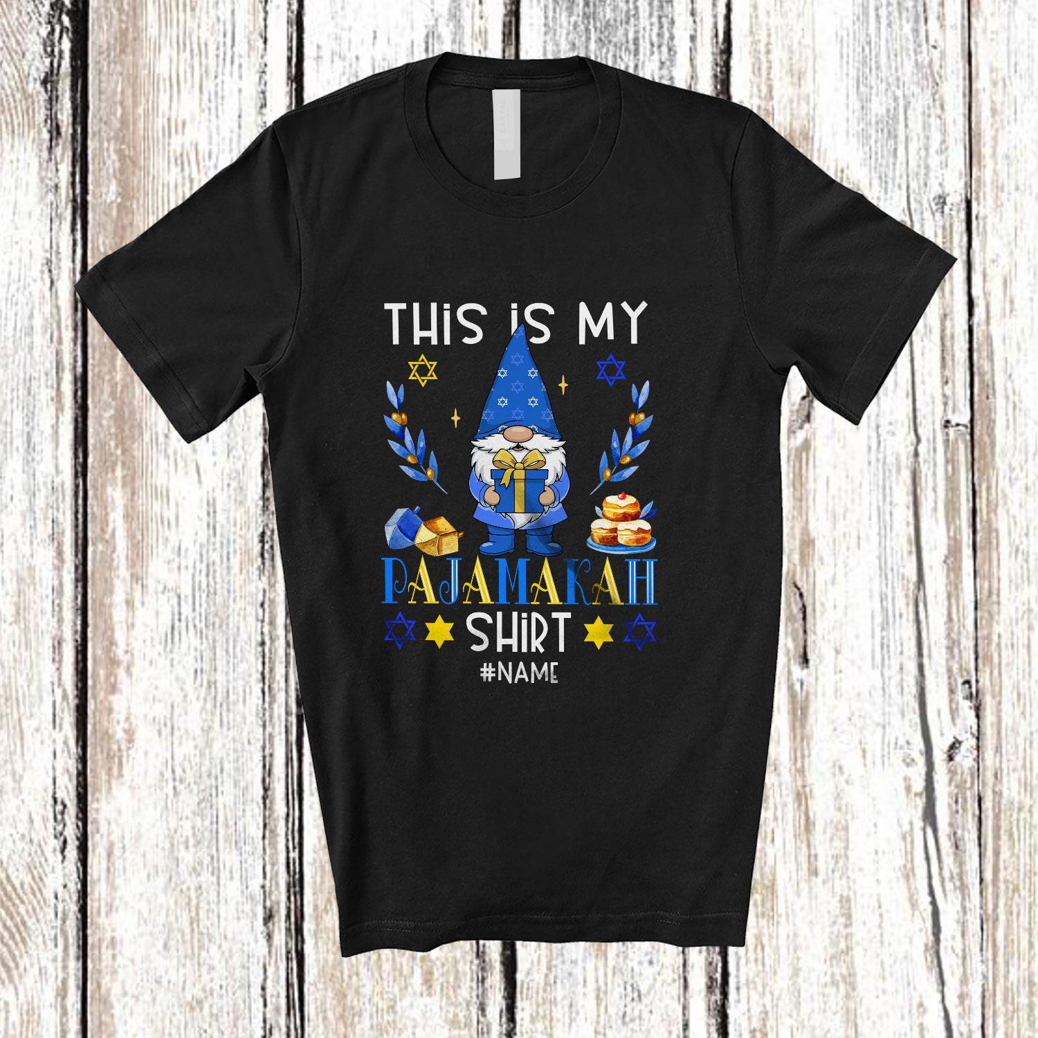 Personalized Custom Name This Is My Pajamakah; Humorous Hanukkah Pajama Gnome; Family T-Shirt. This cotton t-shirt is a durable staple product with a classic fit. One of the most popular items, it has a relaxed style made for everyday and casual wear.