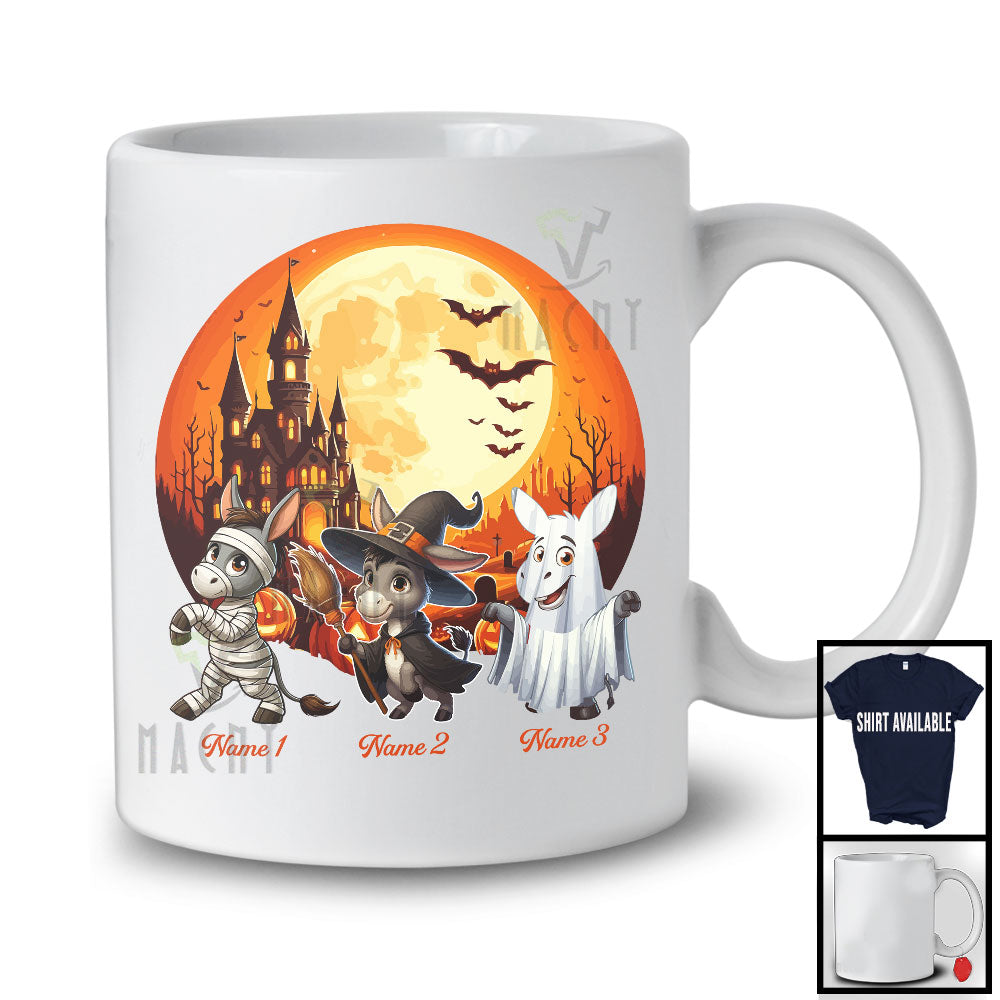 Personalized Custom Name Three Boo Witch Mummy Donkeys, Humorous Halloween Donkey Farmer T-Shirt. This cotton t-shirt is a durable staple product with a classic fit. One of the most popular items, it has a relaxed style made for everyday and casual wear.