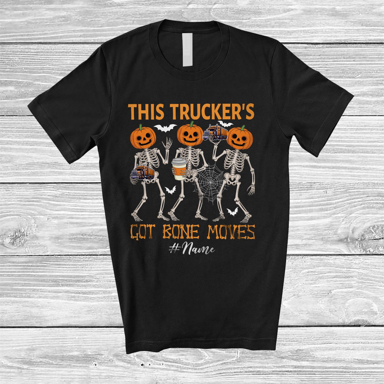 Personalized Custom Name Trucker's Got Bone Moves; Joyful Halloween Pumpkin Skeletons T-Shirt. This cotton t-shirt is a durable staple product with a classic fit. One of the most popular items, it has a relaxed style made for everyday and casual wear.