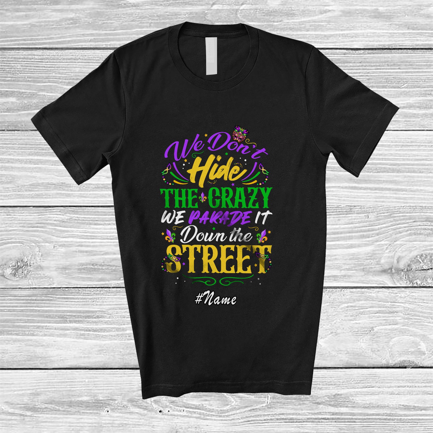 Personalized Custom Name We Don't Hide Crazy Parade Street; Joyful Mardi Gras Mask Beads T-Shirt. This cotton t-shirt is a durable staple product with a classic fit. One of the most popular items, it has a relaxed style made for everyday and casual wear.