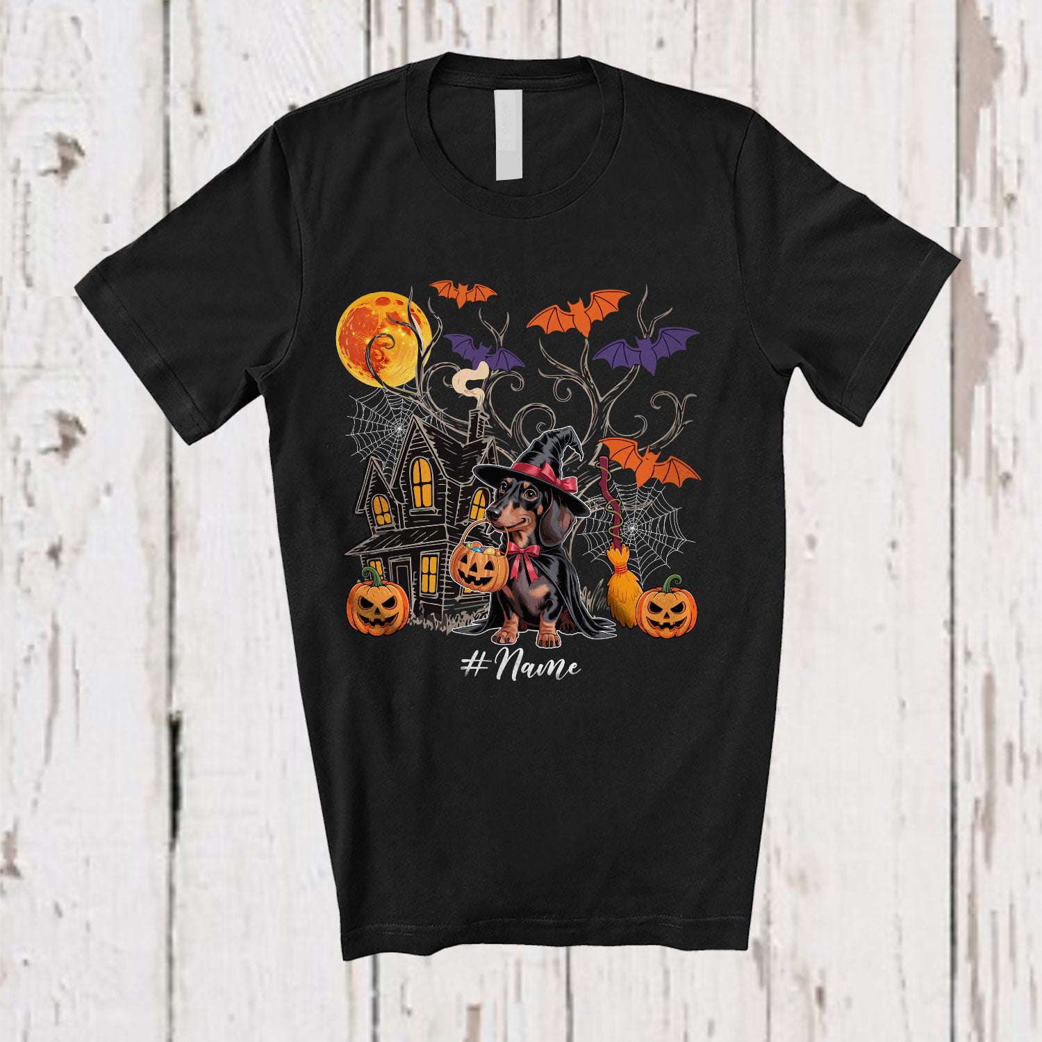 Personalized Custom Name Witch Dachshund Owner Lover; Awesome Halloween Moon Pumpkin Candy T-Shirt. This cotton t-shirt is a durable staple product with a classic fit. One of the most popular items, it has a relaxed style made for everyday and casual wear.
