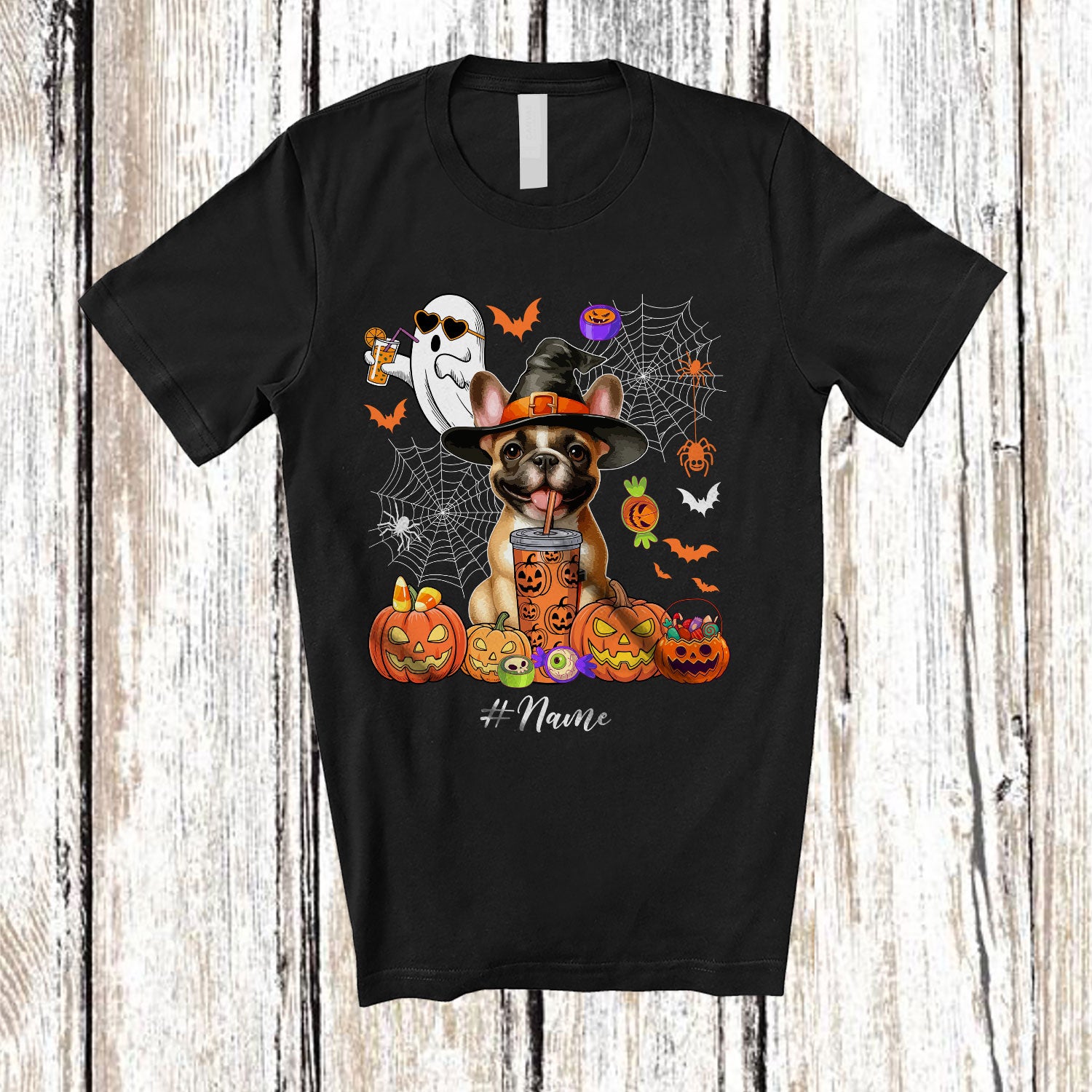 Personalized Custom Name Witch French Bulldog Drink Coffee; Horror Halloween Boo Ghost Pumpkin T-Shirt. This cotton t-shirt is a durable staple product with a classic fit. One of the most popular items, it has a relaxed style made for everyday and casual wear.