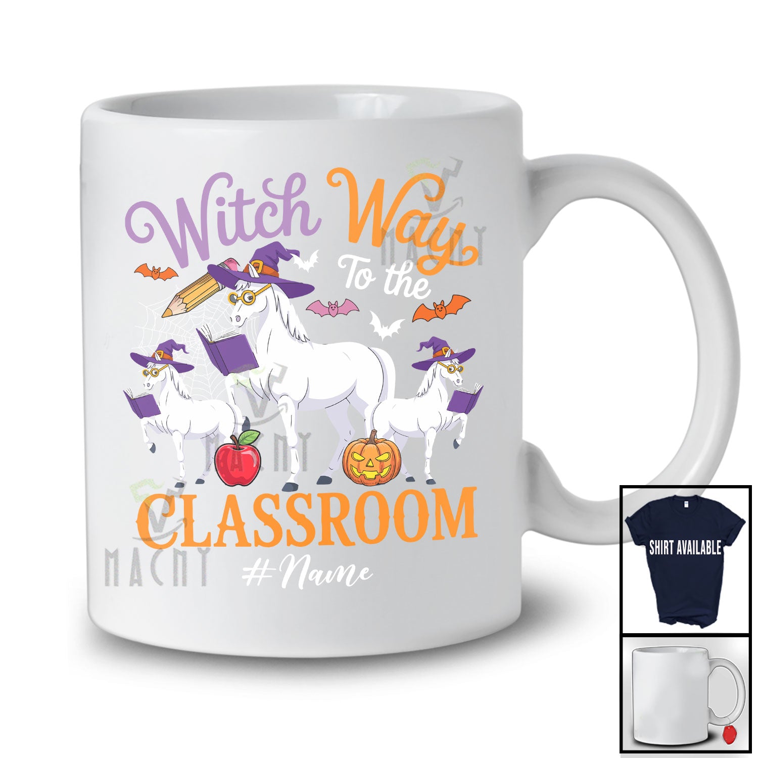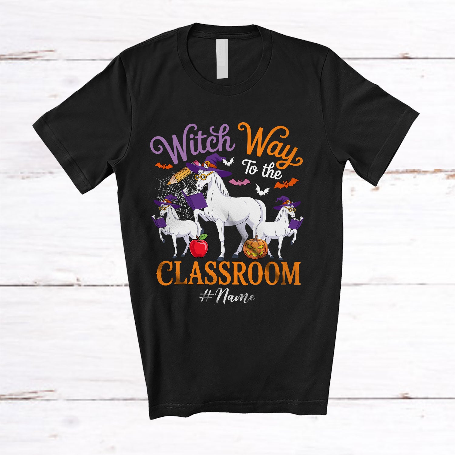 Personalized Custom Name Witch Way To The Classroom; Horror Halloween Three Horse Teacher T-Shirt