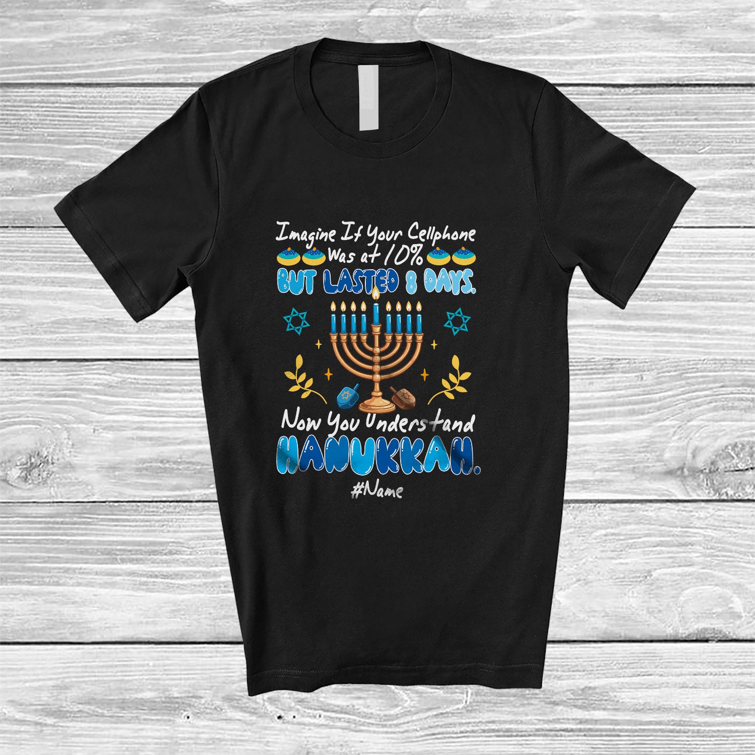 Personalized Custom Name Your Cellphone Was At 10%; Sarcastic Hanukkah Lights Out Of Battery T-Shirt. This cotton t-shirt is a durable staple product with a classic fit. One of the most popular items, it has a relaxed style made for everyday and casual wear.