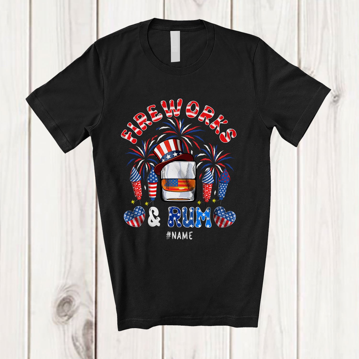 Personalized Fireworks and Rum; Cheerful 4th Of July Custom Name Drinking Drunker Patriotic T-Shirt