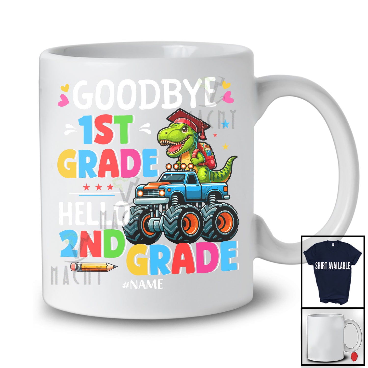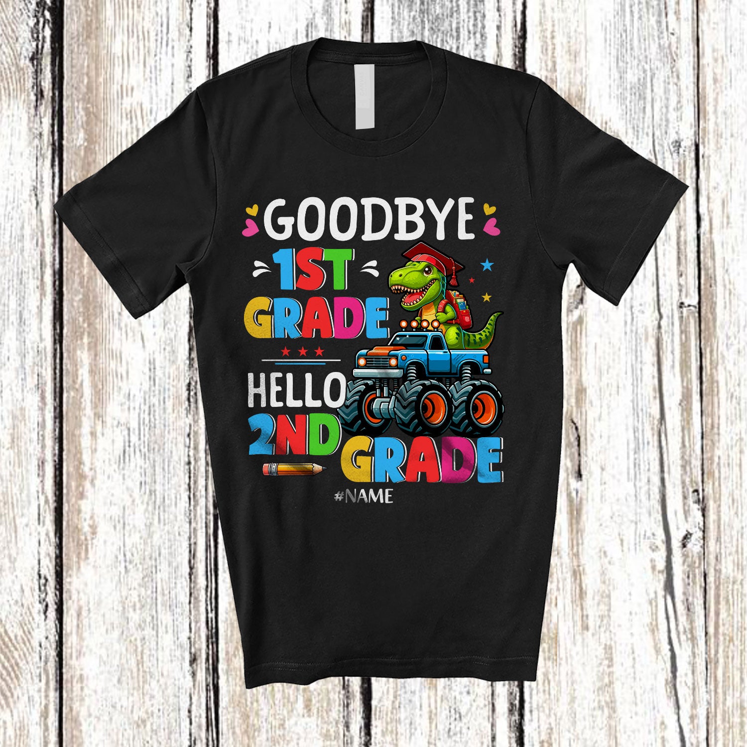 • Personalized Goodbye 1st Grade Hello 2nd Grade; Joyful Graduate Custom Name T-Rex Monster Truck T-Shirt. This cotton t-shirt is a durable staple product with a classic fit. One of the most popular items, it has a relaxed style made for everyday and casual wear.