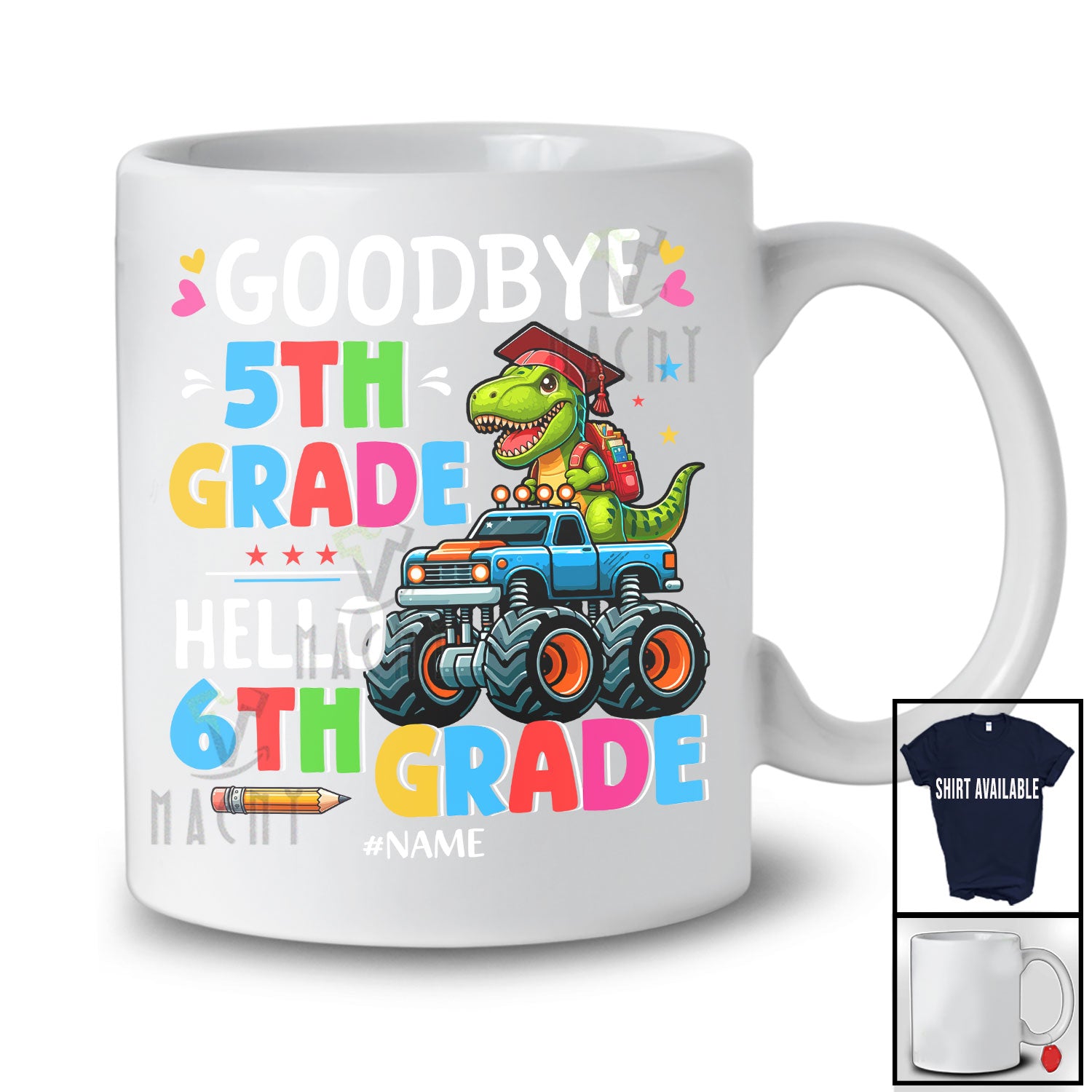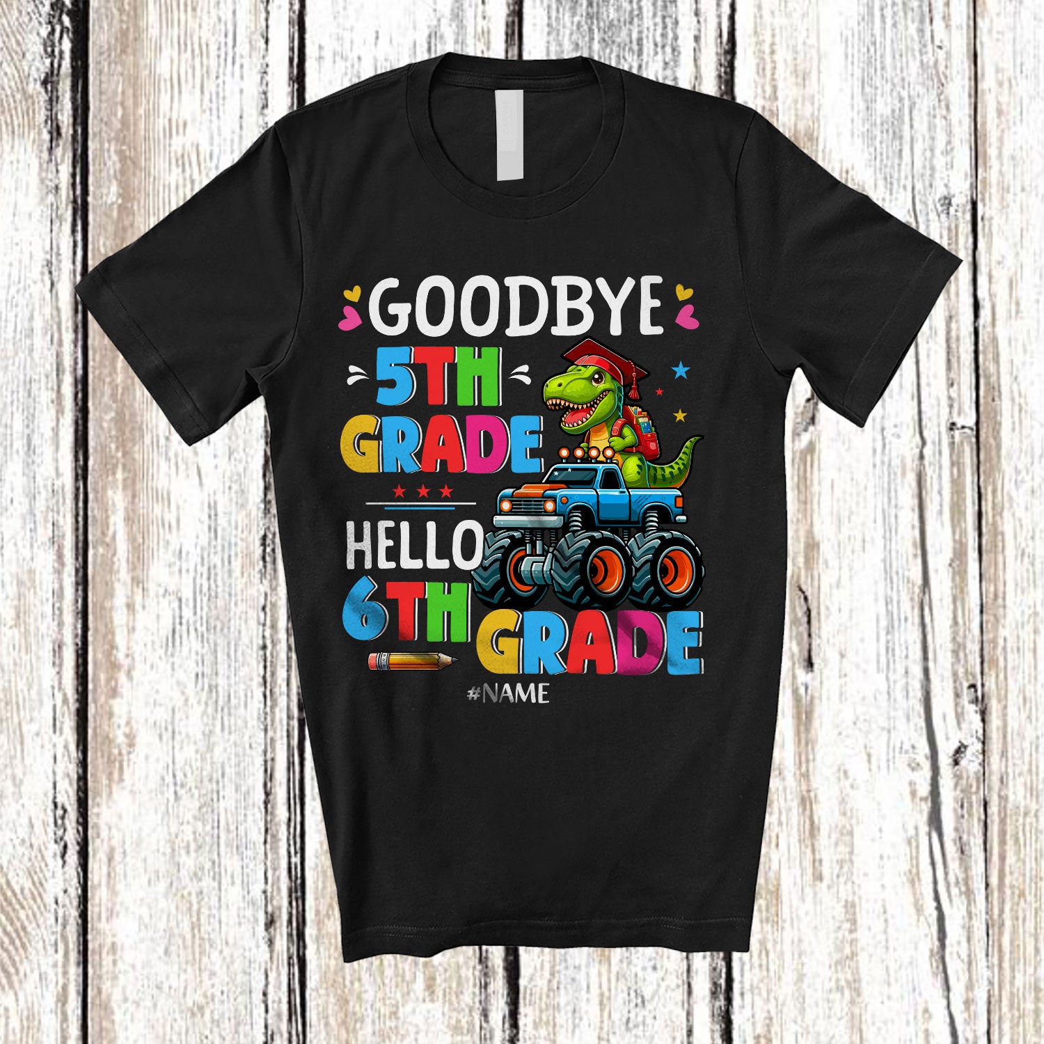 Personalized Goodbye 5th Grade Hello 6th Grade; Joyful Graduate Custom Name T-Rex Monster Truck T-Shirt. This cotton t-shirt is a durable staple product with a classic fit. One of the most popular items, it has a relaxed style made for everyday and casual wear.