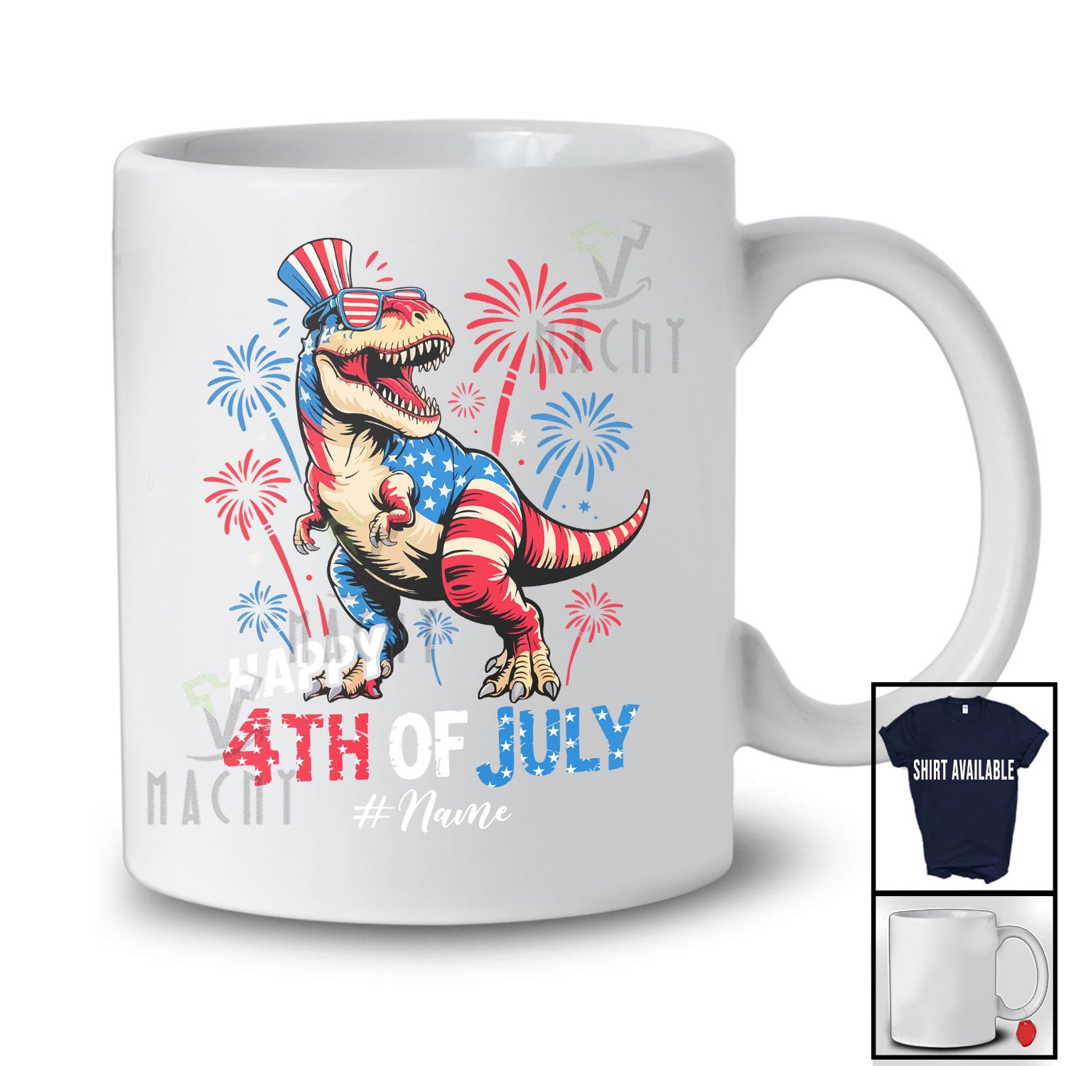 Personalized Happy 4th of July; Joyful Independence Day T-Rex Dinosaur; Custom Name Patriotic T-Shirt. This cotton t-shirt is a durable staple product with a classic fit. One of the most popular items, it has a relaxed style made for everyday and casual wear.