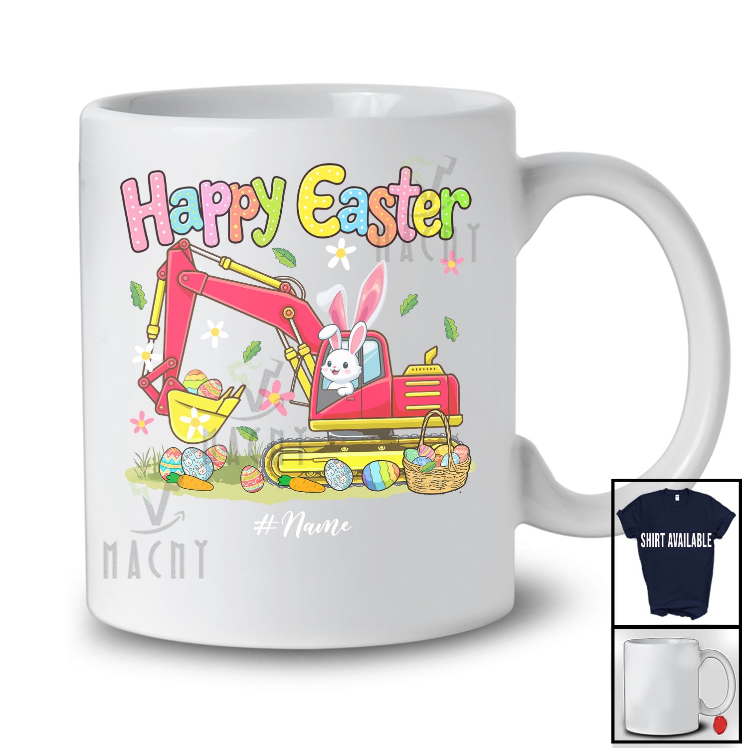 Personalized Happy Easter; Adorable Custom Name Bunny Driving Excavator; Driver Egg Hunt T-Shirt. This cotton t-shirt is a durable staple product with a classic fit. One of the most popular items, it has a relaxed style made for everyday and casual wear.