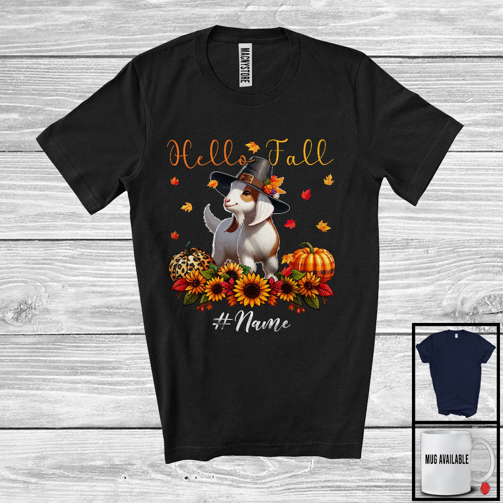Personalized Hello Fall; Adorable Thanksgiving Custom Name Goat Plaid Leopard Pumpkin; Farmer T-Shirt