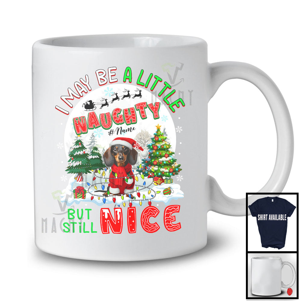 • Personalized I May Be A Little Naughty; Humorous Christmas Custom Name Dachshund Santa T-Shirt. This cotton t-shirt is a durable staple product with a classic fit. One of the most popular items, it has a relaxed style made for everyday and casual wear.