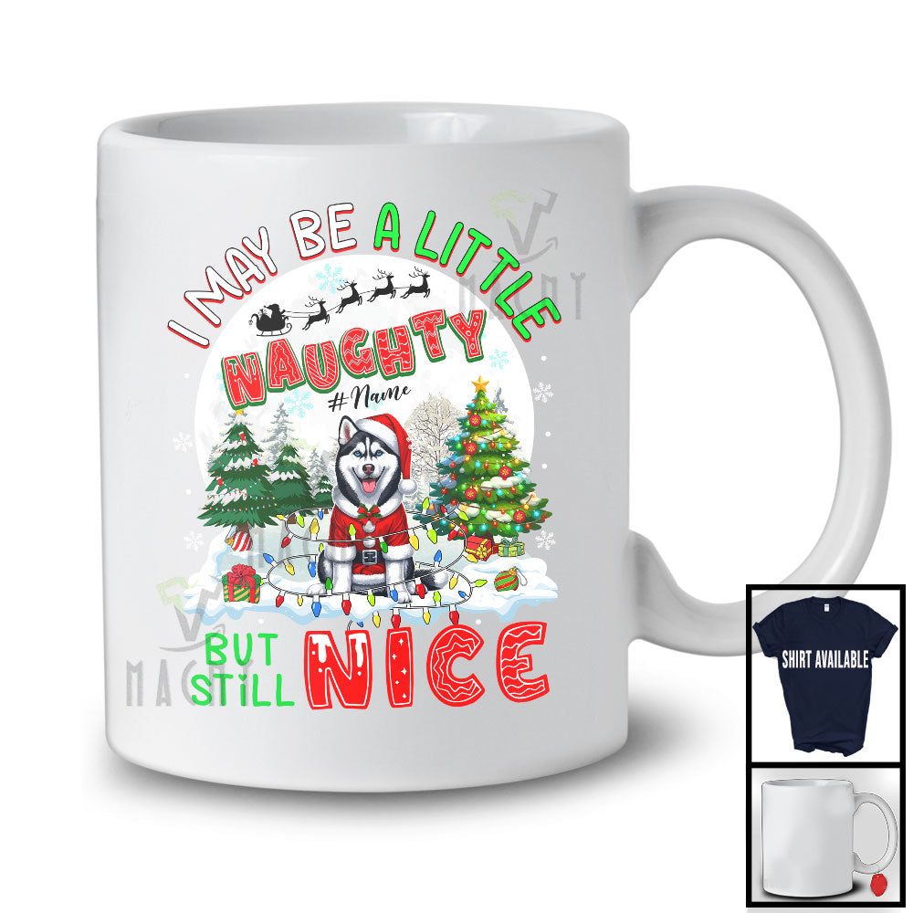 Personalized I May Be A Little Naughty; Humorous Christmas Custom Name Husky Santa T-Shirt. This cotton t-shirt is a durable staple product with a classic fit. One of the most popular items, it has a relaxed style made for everyday and casual wear.