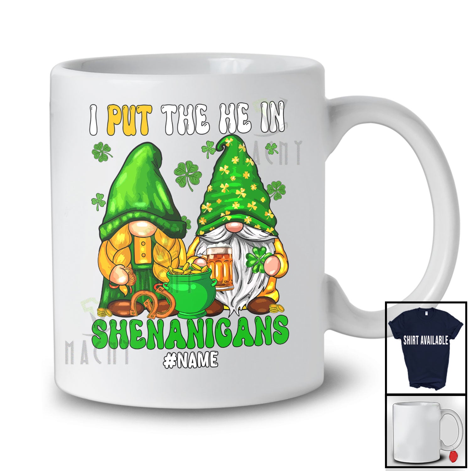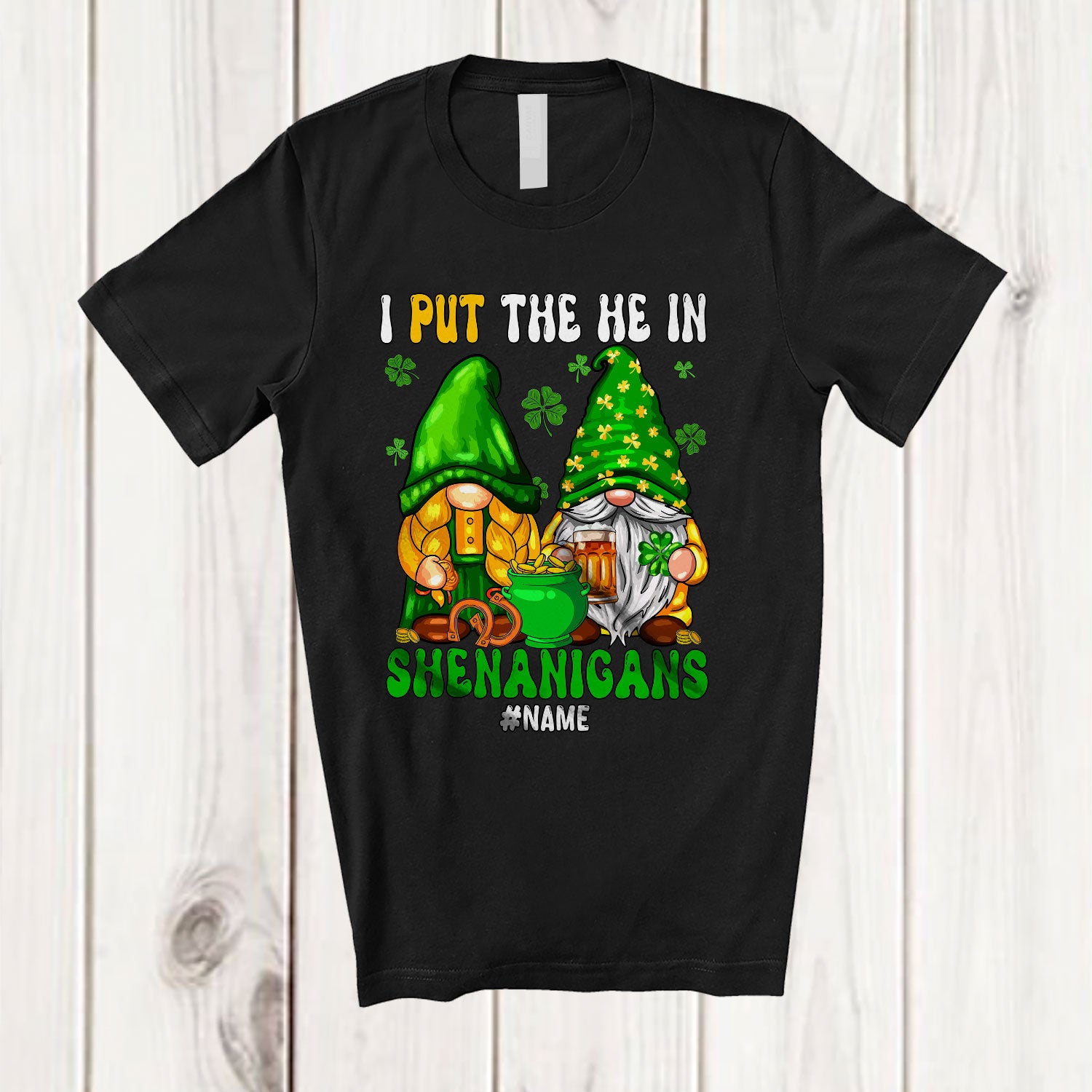 Personalized I Put The He In Shenanigans; Lovely St. Patrick's Day Custom Name Gnomes; Couple T-Shirt. This cotton t-shirt is a durable staple product with a classic fit. One of the most popular items, it has a relaxed style made for everyday and casual wear.