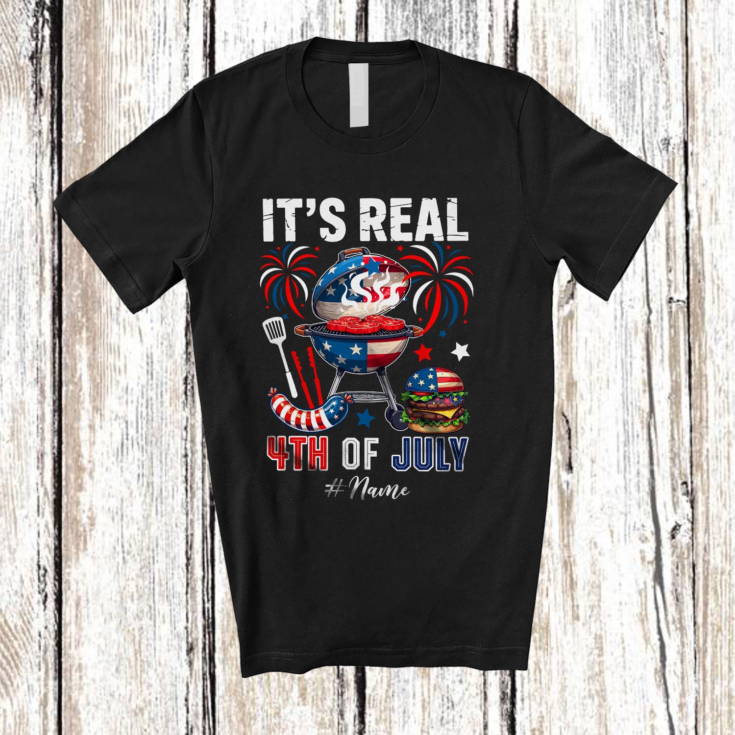 • Personalized It's Real 4th of July; Amusing Custom Name BBQ Tools US Flag; Patriotic T-Shirt. This cotton t-shirt is a durable staple product with a classic fit. One of the most popular items, it has a relaxed style made for everyday and casual wear.