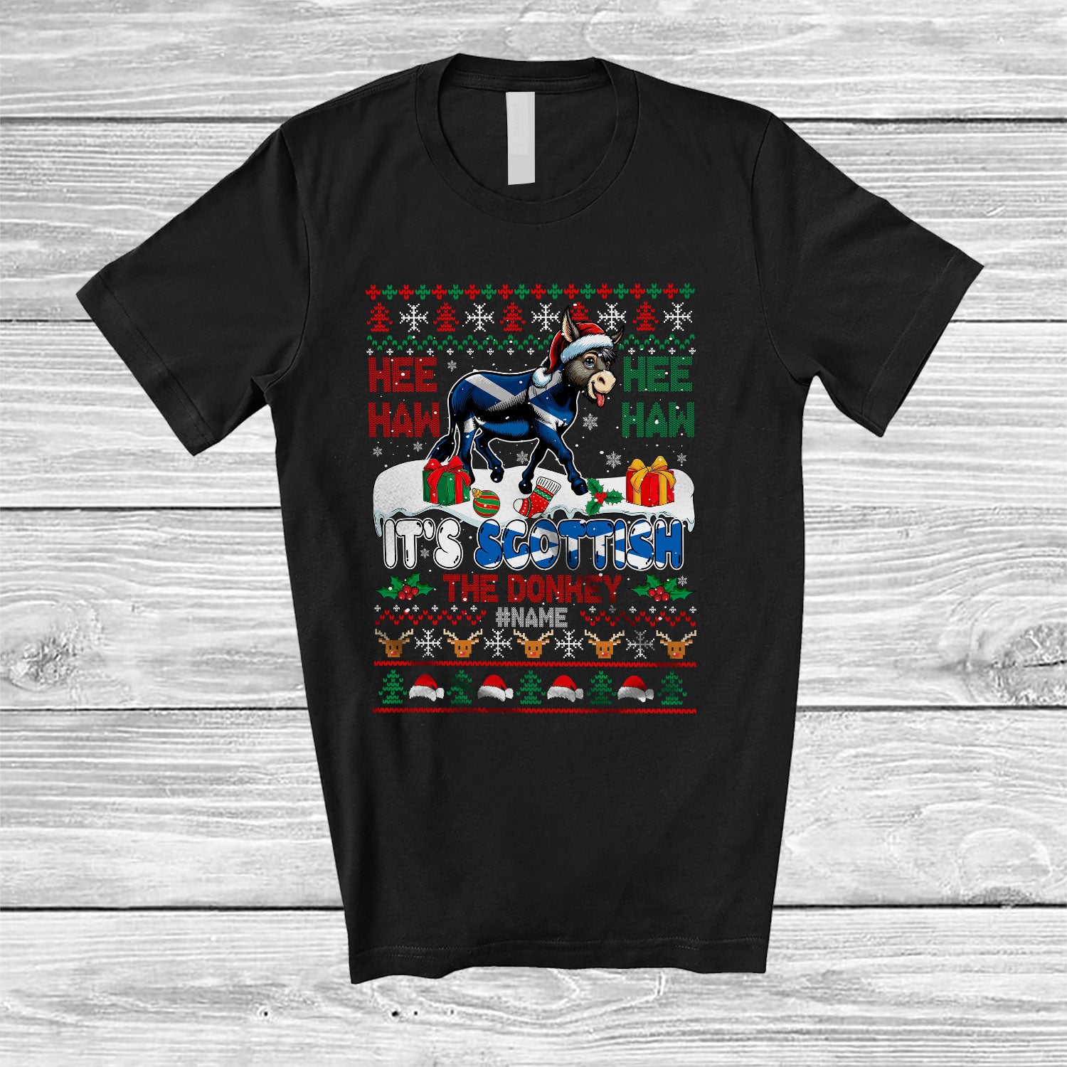• Personalized It's Scottish The Donkey; Amazing Christmas Sweater; Custom Name Santa Donkey T-Shirt. This cotton t-shirt is a durable staple product with a classic fit. One of the most popular items, it has a relaxed style made for everyday and casual wear.
