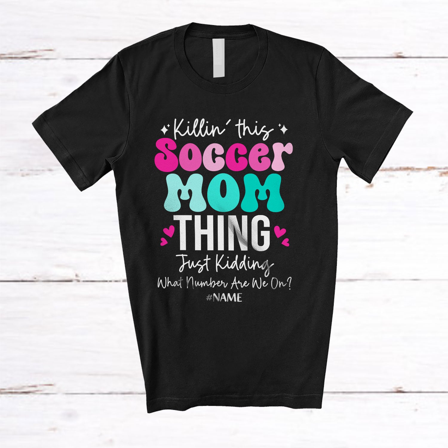 Personalized Killin' This Soccer Mom; Humorous Mother's Day Hearts Soccer; Custom Name Player T-Shirt. This cotton t-shirt is a durable staple product with a classic fit. One of the most popular items, it has a relaxed style made for everyday and casual wear.