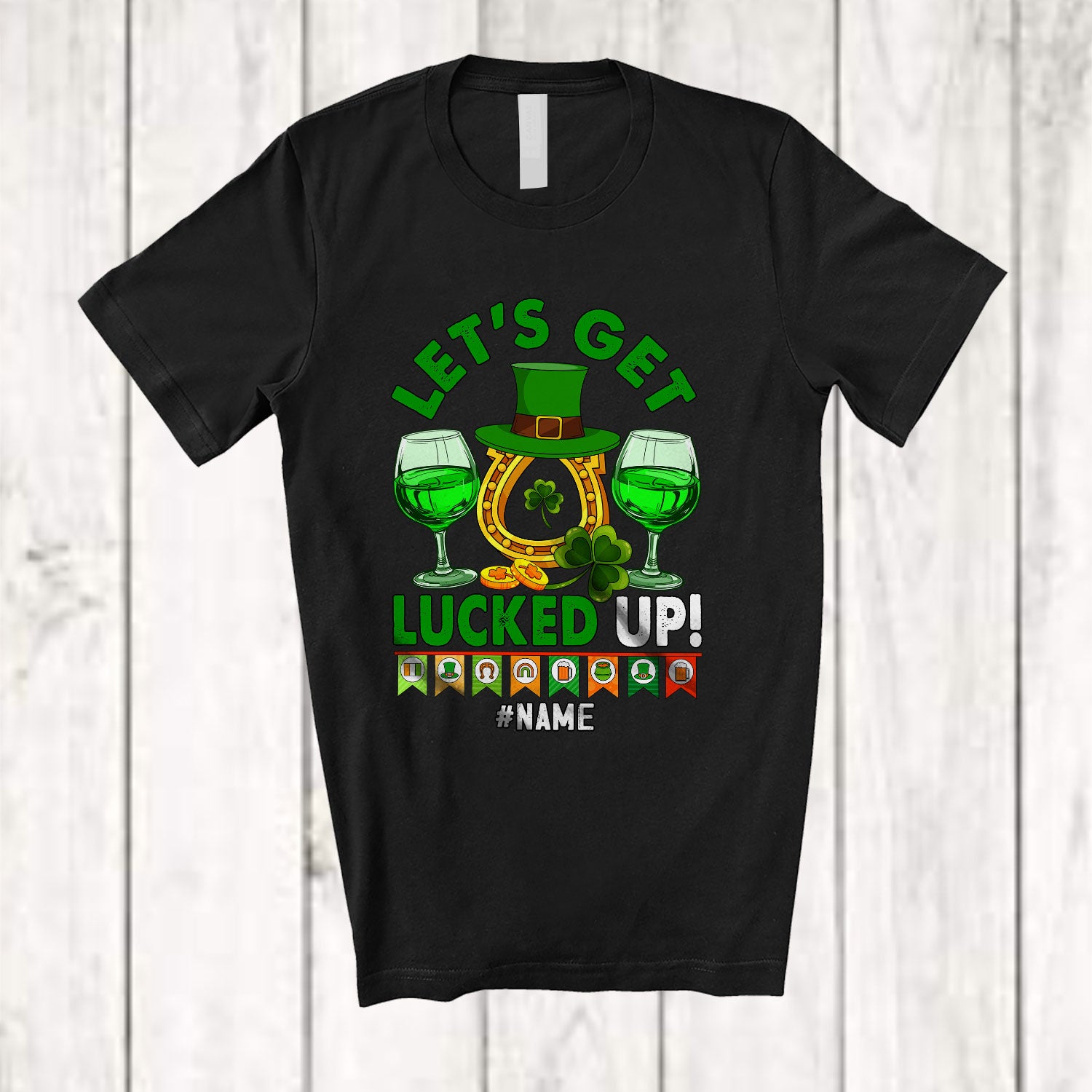 Personalized Let's Get Lucked Up; Amazing St. Patrick's Day Wine Horseshoe; Drinking Drunker T-Shirt. This cotton t-shirt is a durable staple product with a classic fit. One of the most popular items, it has a relaxed style made for everyday and casual wear.