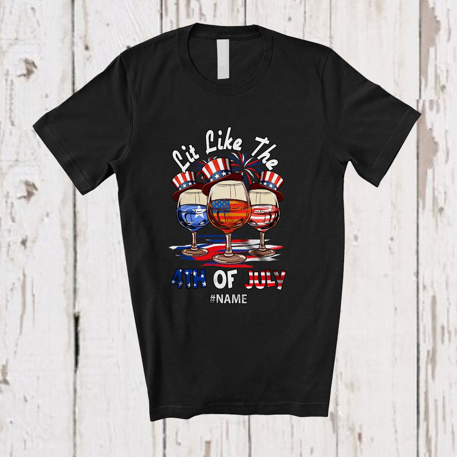 Personalized Lit Like The 4th of July; Funny Three Rum Glasses Drinking Patriotic Lover T-Shirt. This cotton t-shirt is a durable staple product with a classic fit. One of the most popular items, it has a relaxed style made for everyday and casual wear.