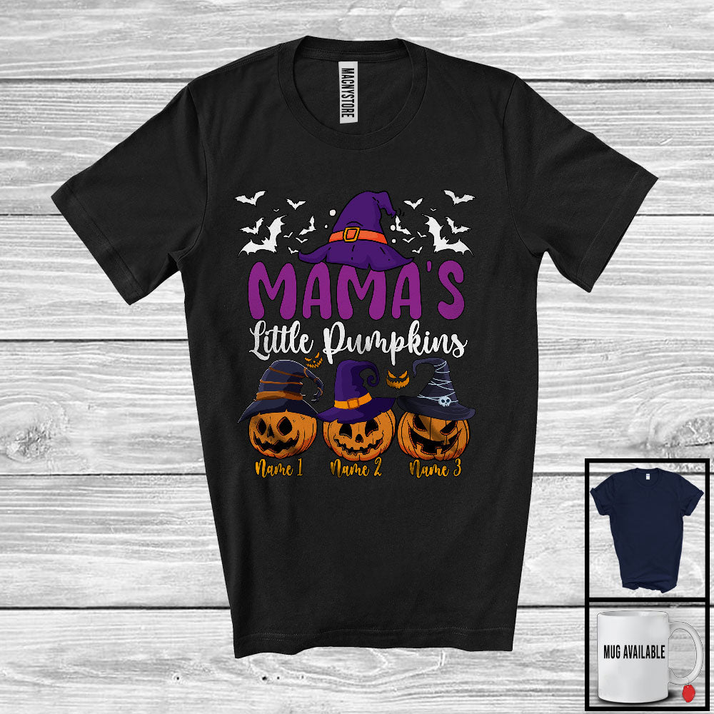 Personalized Mama's Little Pumpkins; Scary Halloween Custom Name Witch; Family Group T-Shirt. This cotton t-shirt is a durable staple product with a classic fit. One of the most popular items, it has a relaxed style made for everyday and casual wear.