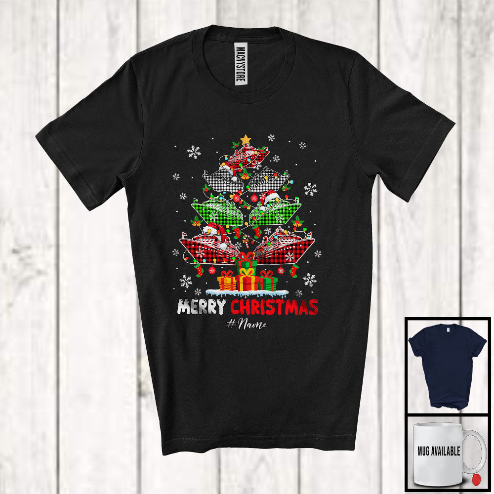 Personalized Merry Christmas; Joyful X-mas Tree Plaid Cruise Ship; Captain Custom Name Family T-Shirt