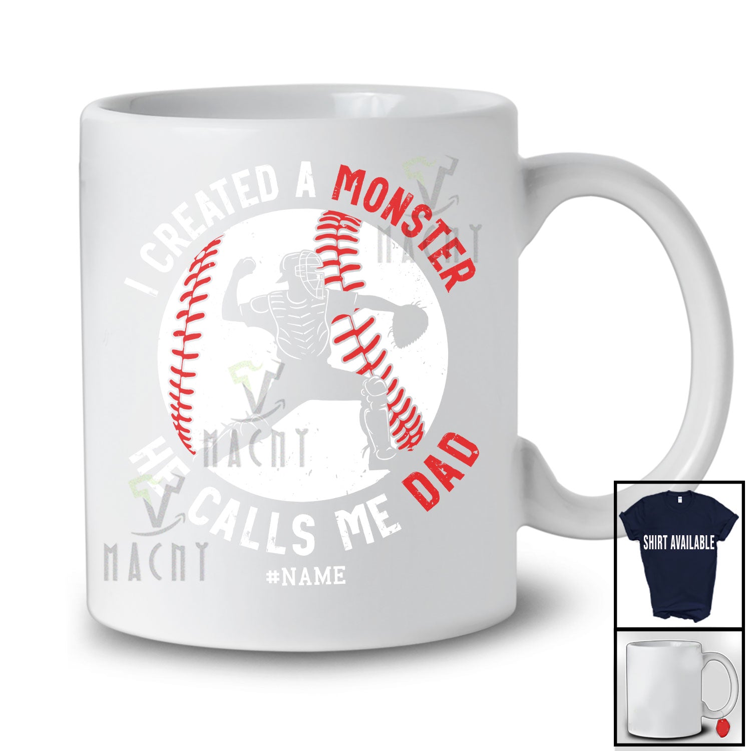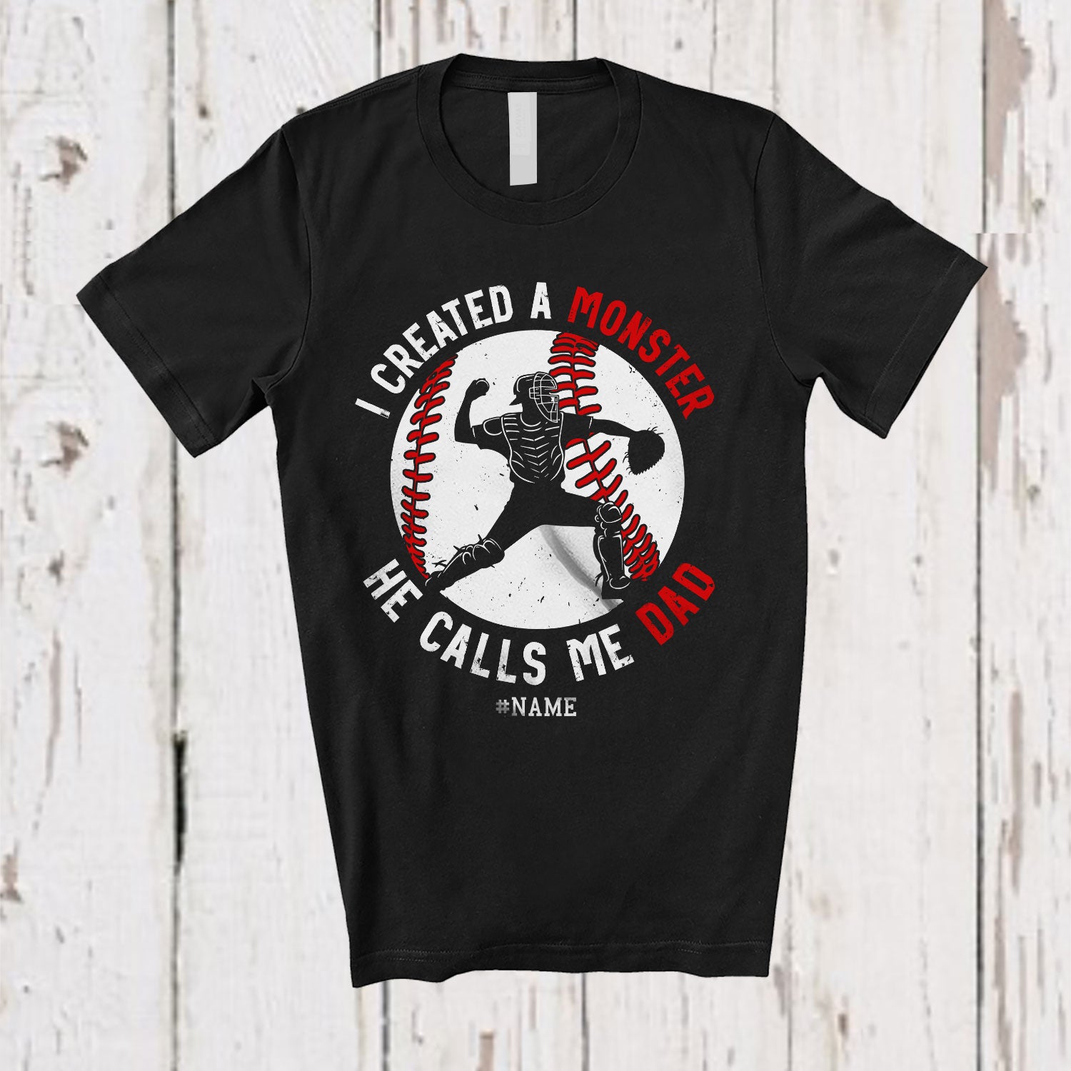 Personalized Monster He Calls Me Dad; Amusing Father's Day Custom Name Catcher Baseball; Family T-Shirt. This cotton t-shirt is a durable staple product with a classic fit. One of the most popular items, it has a relaxed style made for everyday and casual wear.
