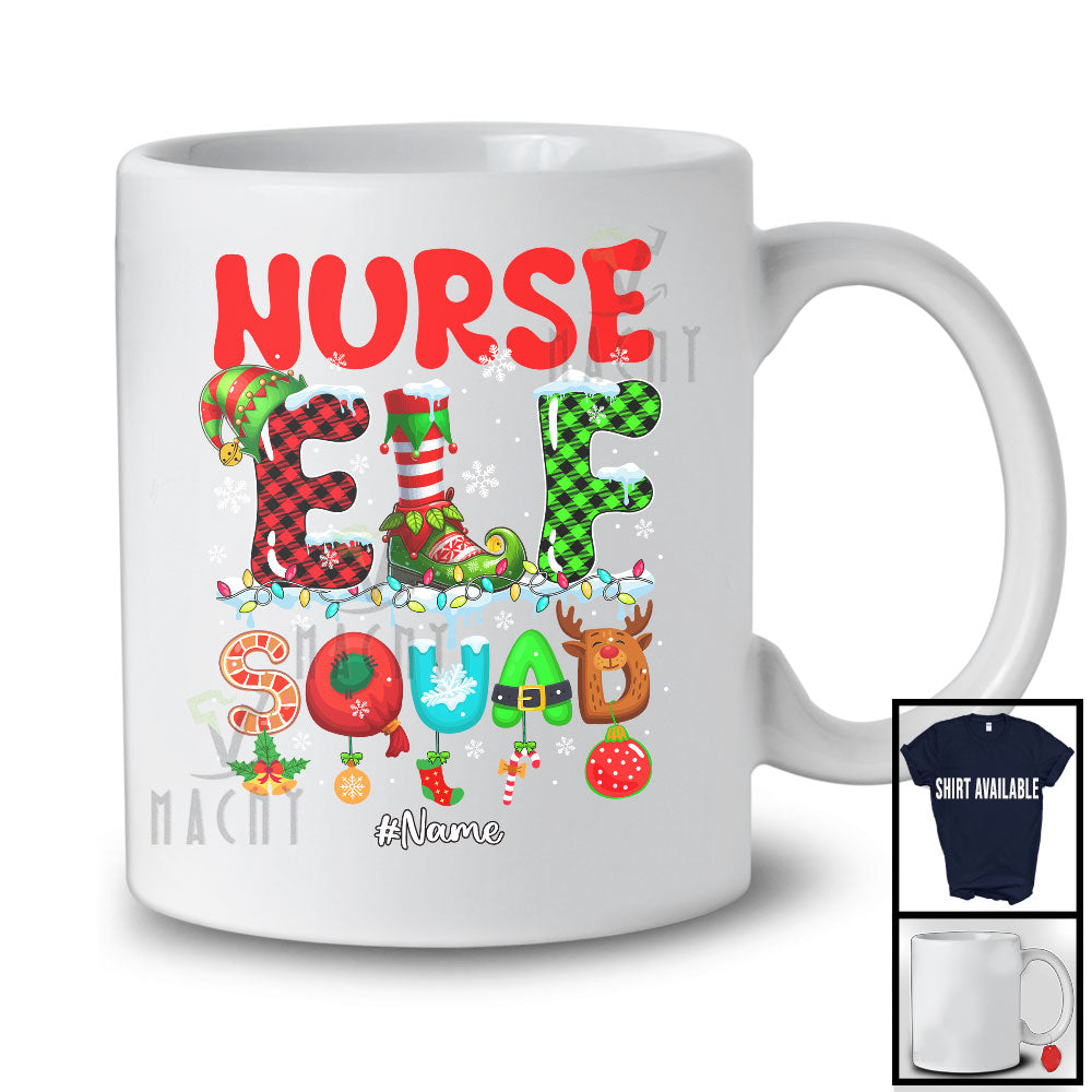 Personalized Nurse Elf Squad; Colorful Christmas Lights Plaid Elf; Custom Name Family Group T-Shirt
