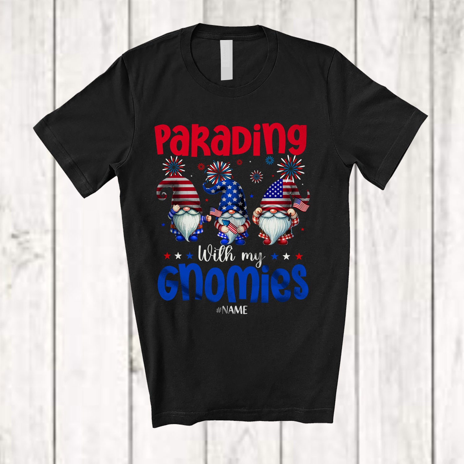 Personalized Parading With My Gnomies; Joyful 4th Of July Three Gnomes; Custom Name Parades T-Shirt. This cotton t-shirt is a durable staple product with a classic fit. One of the most popular items, it has a relaxed style made for everyday and casual wear.