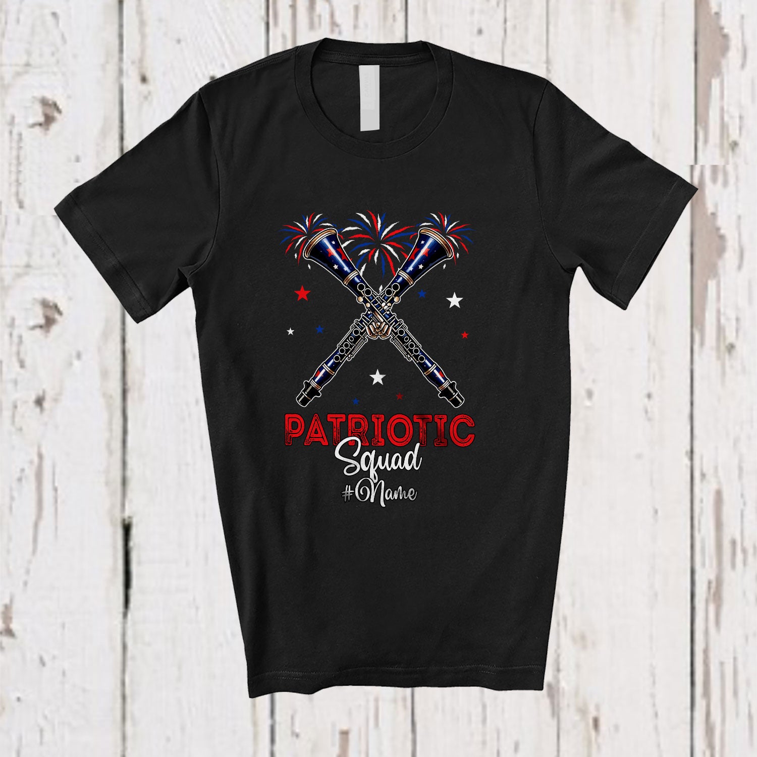 Personalized Patriotic Squad; Amusing 4th Of July Custom Name Clarinet Player; Patriotic T-Shirt. This cotton t-shirt is a durable staple product with a classic fit. One of the most popular items, it has a relaxed style made for everyday and casual wear.