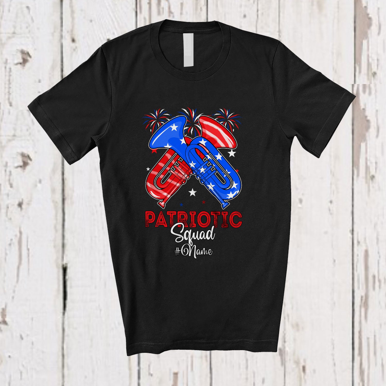 Personalized Patriotic Squad; Amusing 4th Of July Custom Name Trumpet Player; Patriotic T-Shirt. This cotton t-shirt is a durable staple product with a classic fit. One of the most popular items, it has a relaxed style made for everyday and casual wear.