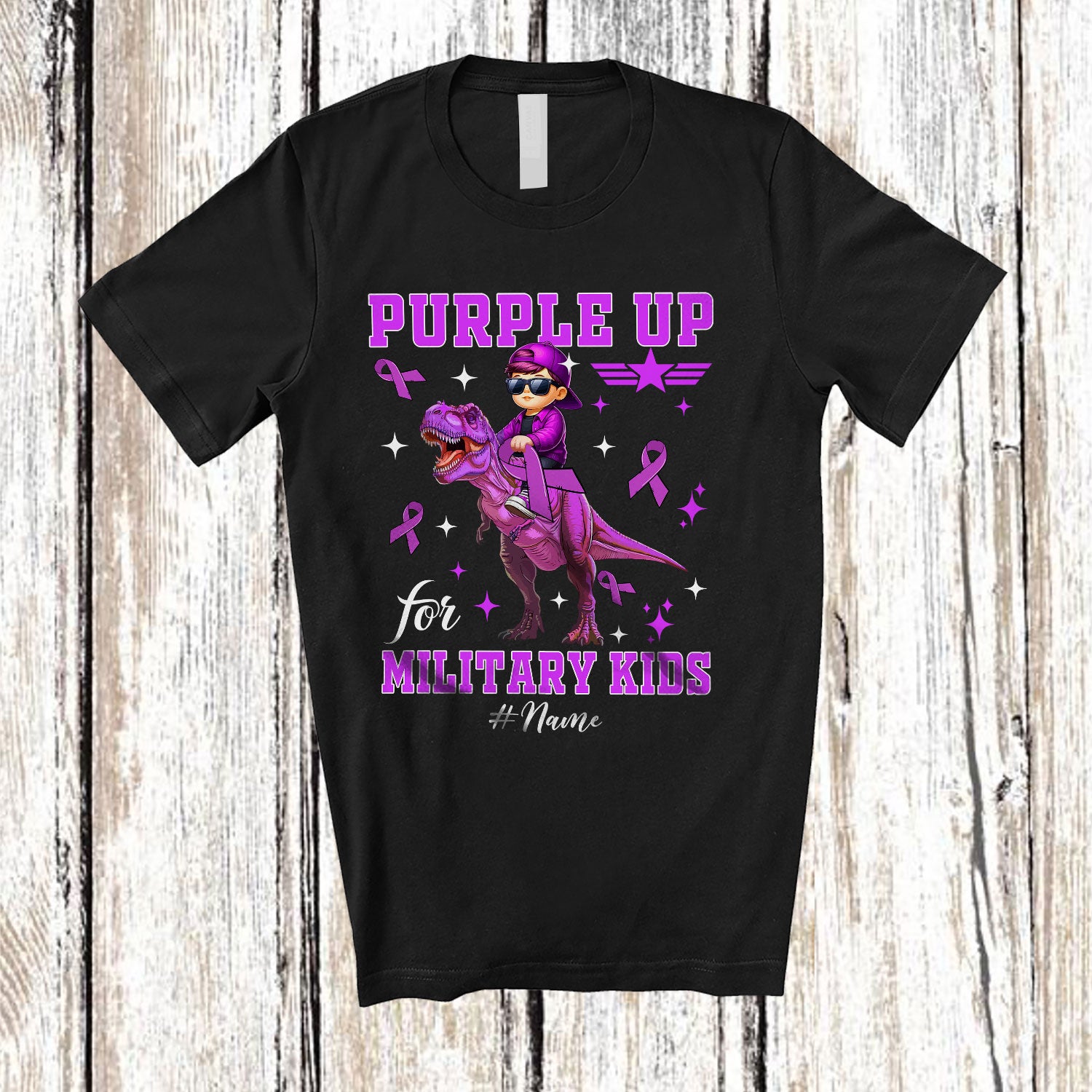 Personalized Purple Up Military Kids; Lovely Military Child Month Custom Name Boy Riding T-Rex T-Shirt. This cotton t-shirt is a durable staple product with a classic fit. One of the most popular items, it has a relaxed style made for everyday and casual wear.
