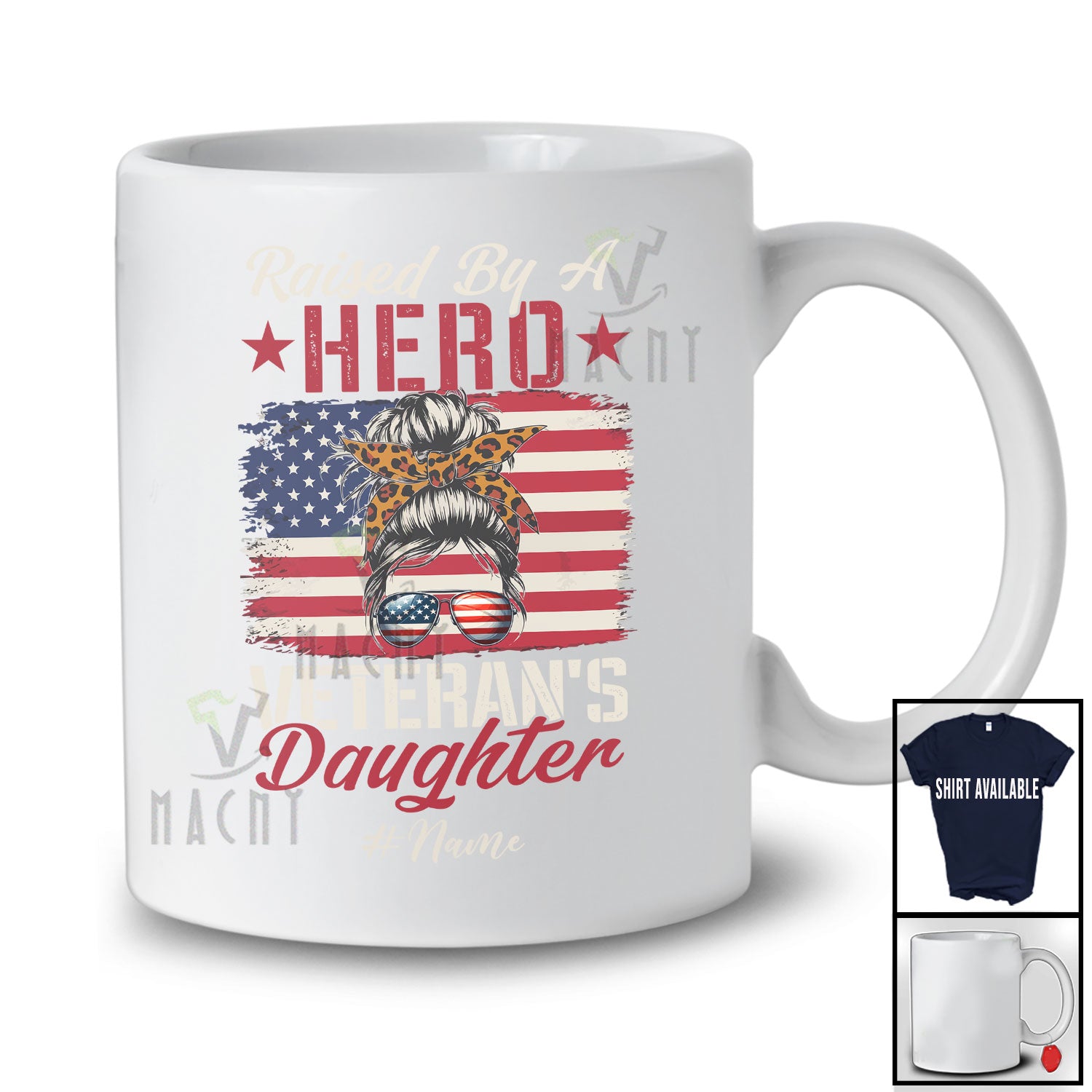 Personalized Raised By A Hero Veteran's Daughter; Proud Custom Name Messy Bun Hair; US Flag T-Shirt