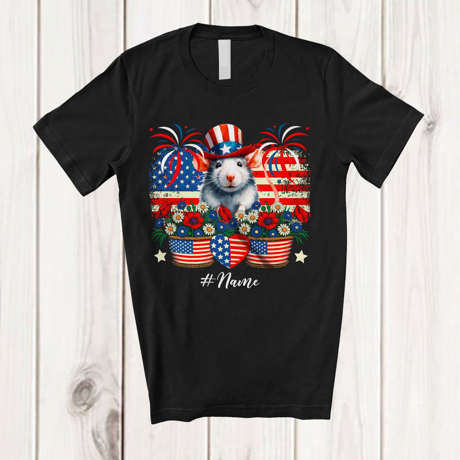 Personalized Rat Flowers Wearing American Flag Hat; Lovely 4th Of July Custom Name Patriotic T-Shirt