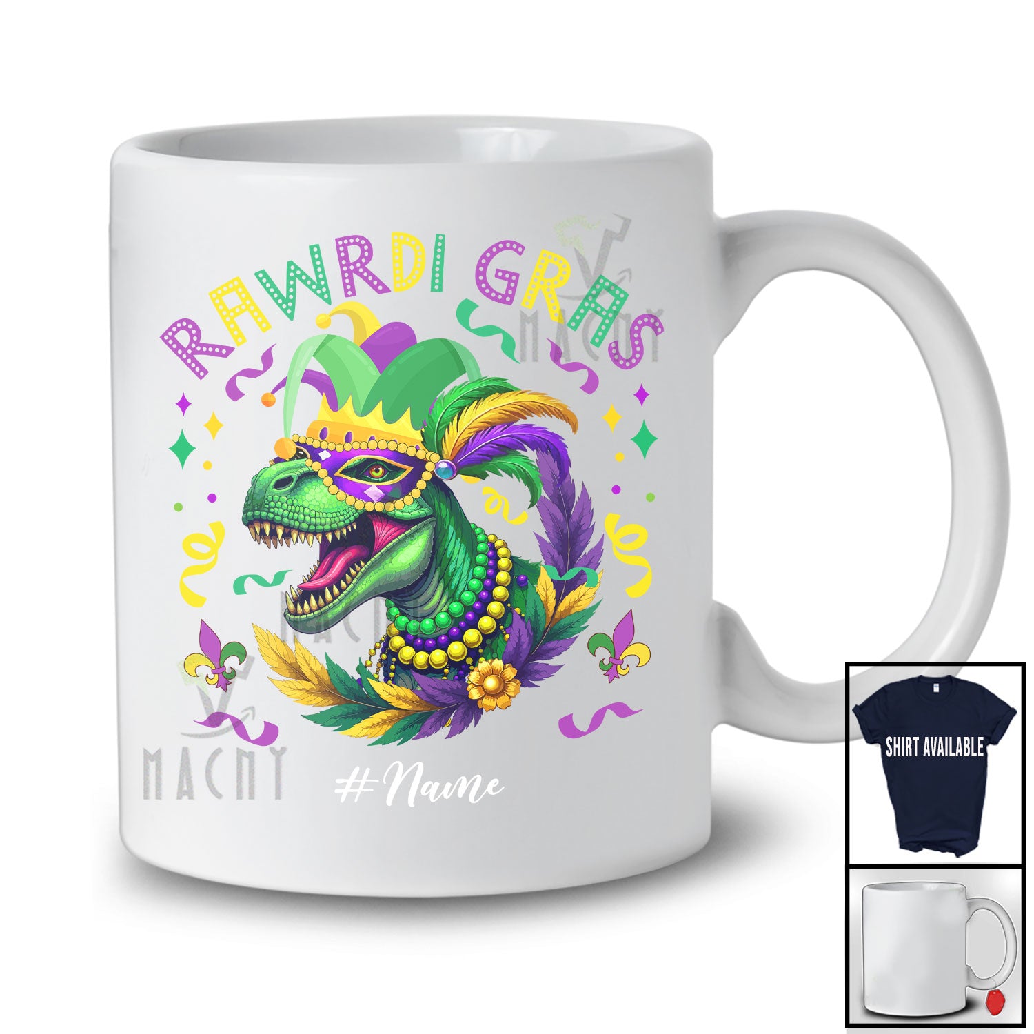 Personalized Rawrdi Gras; Joyful Mardi Gras Masked Beads T-Rex; Custom Name Festival Parades T-Shirt. This cotton t-shirt is a durable staple product with a classic fit. One of the most popular items, it has a relaxed style made for everyday and casual wear.