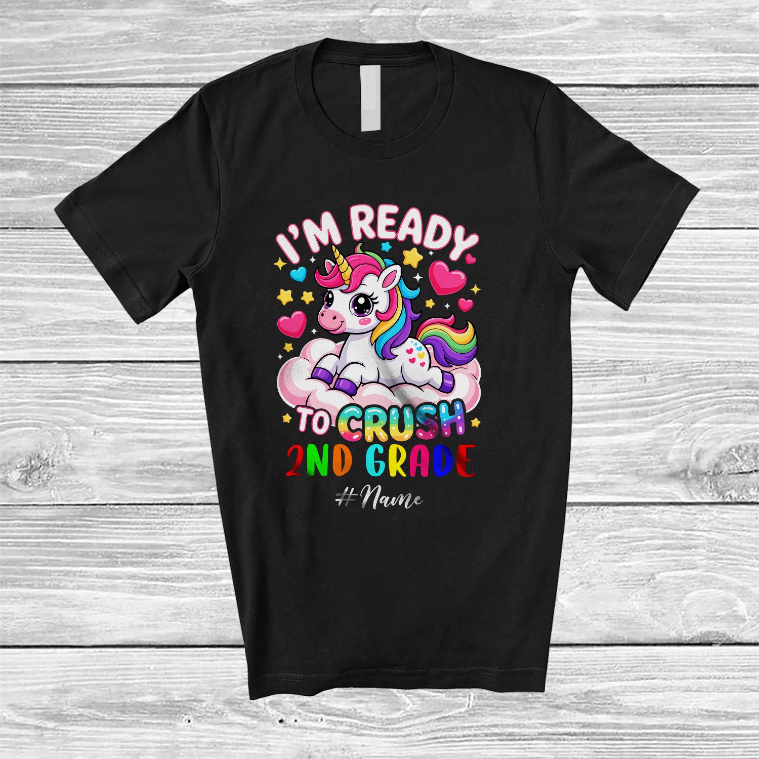 Personalized Ready To Crush 2nd Grade; Lovely First Day Of School Unicorn Custom Name Students T-Shirt. This cotton t-shirt is a durable staple product with a classic fit. One of the most popular items, it has a relaxed style made for everyday and casual wear.