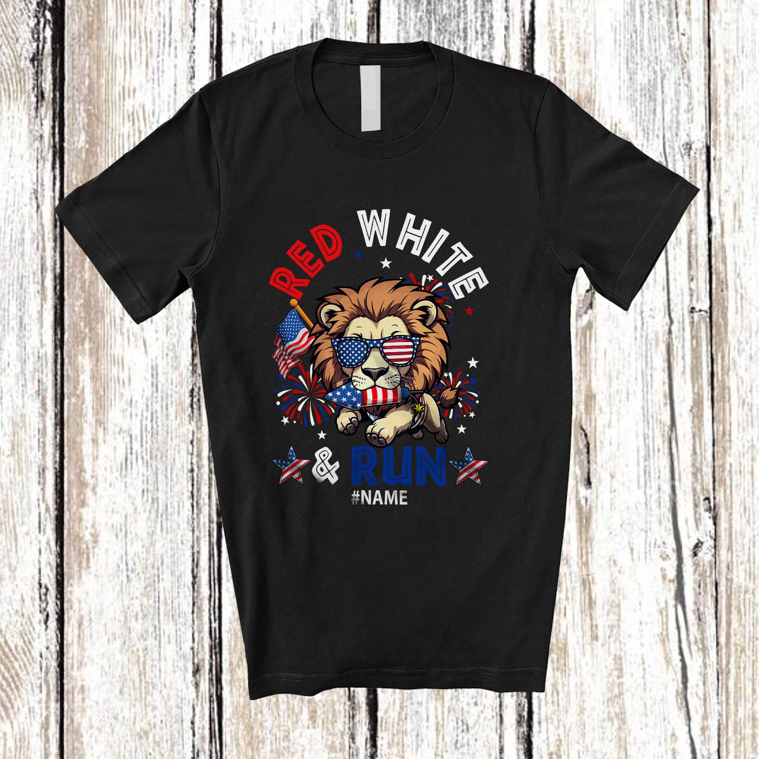Personalized Red White Run; Awesome 4th Of July Running Lion Runner; Custom Name Patriotic T-Shirt