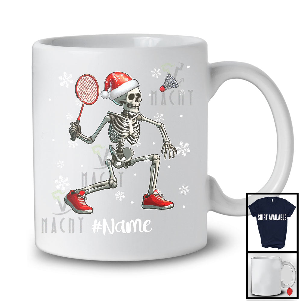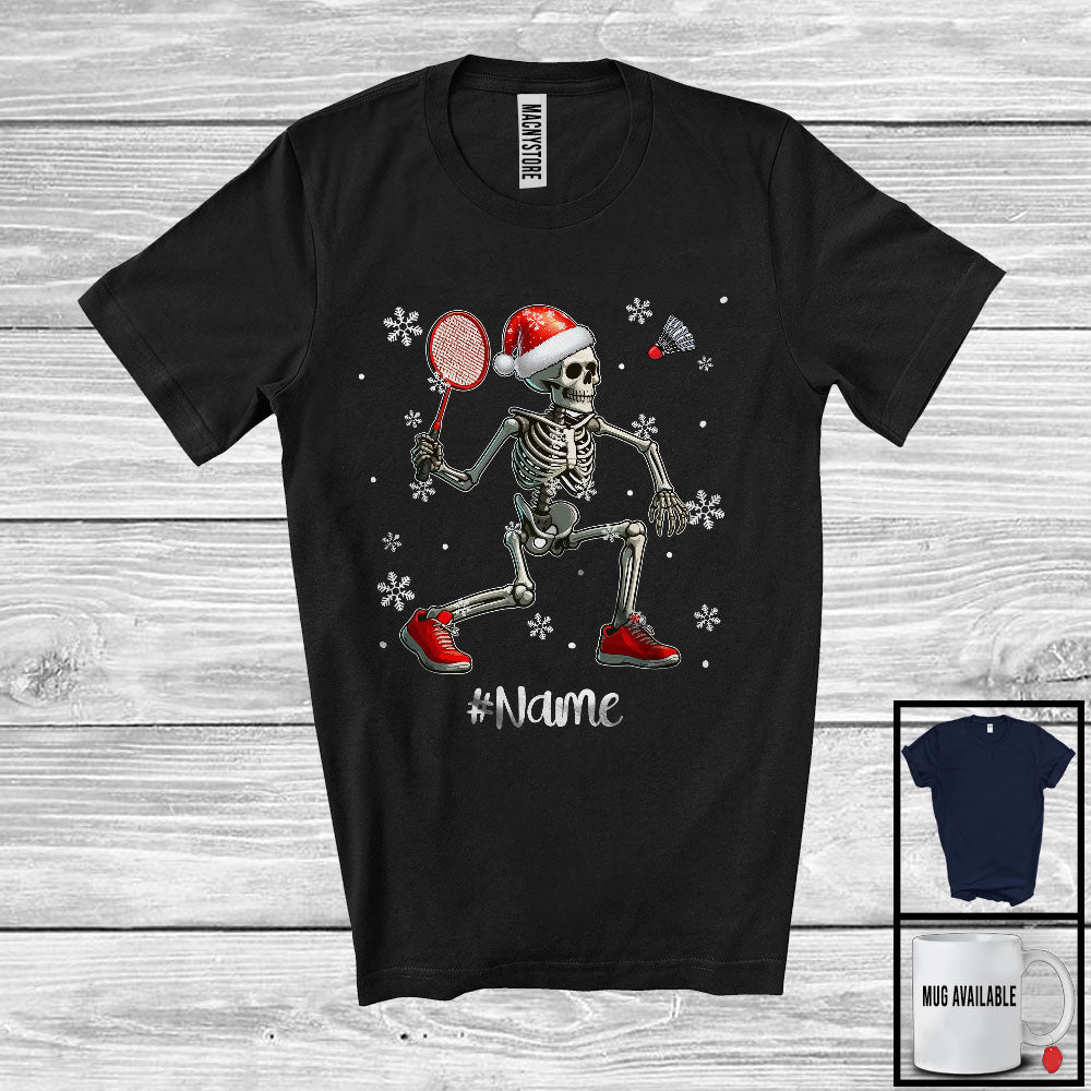 Personalized Santa Skeleton Playing Badminton, Joyful Christmas Custom Name Badminton Player T-Shirt