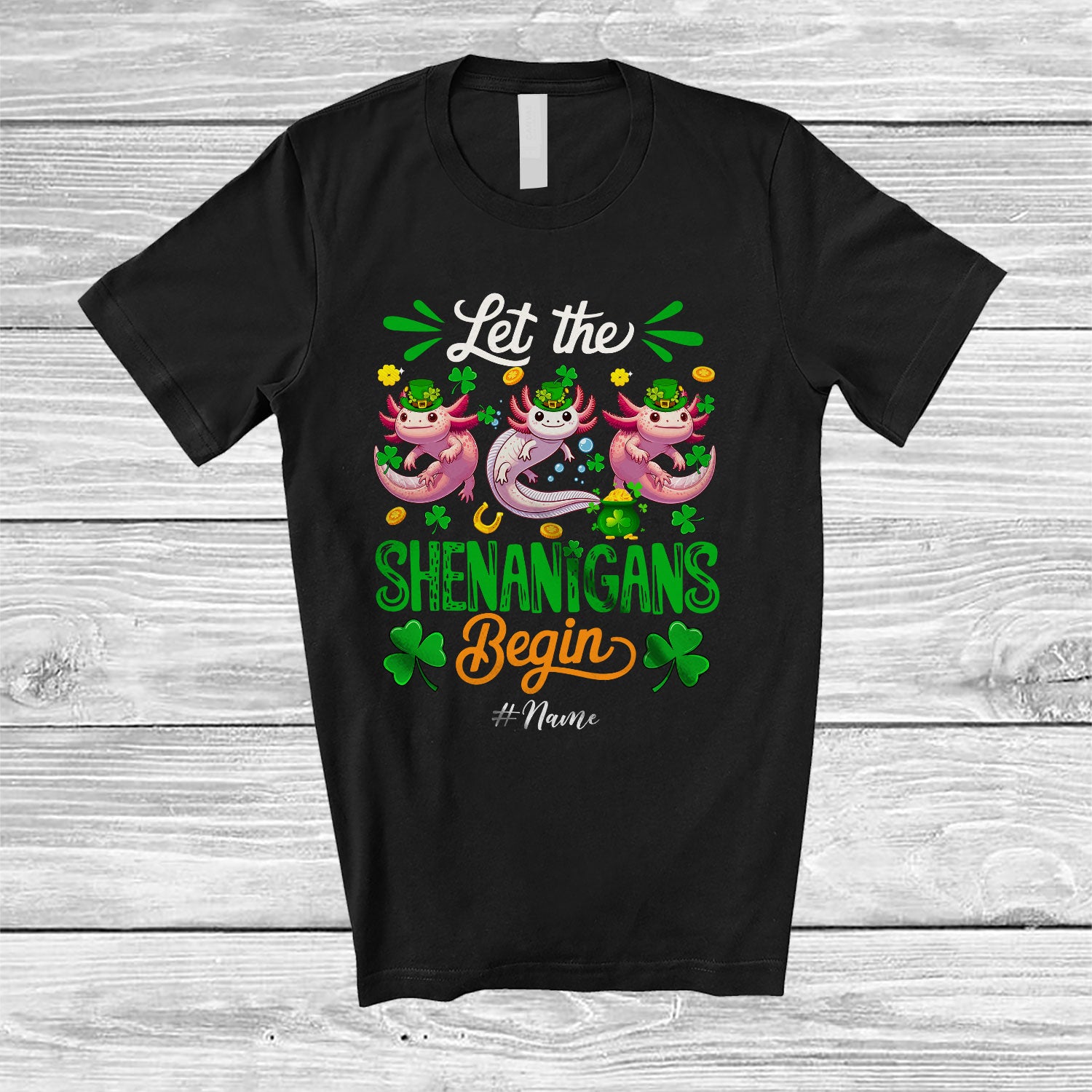 Personalized Shenanigans Begin; Amusing St. Patrick's Day Custom Name Three Axolotls Leprechaun T-Shirt. This cotton t-shirt is a durable staple product with a classic fit. One of the most popular items, it has a relaxed style made for everyday and casual wear.