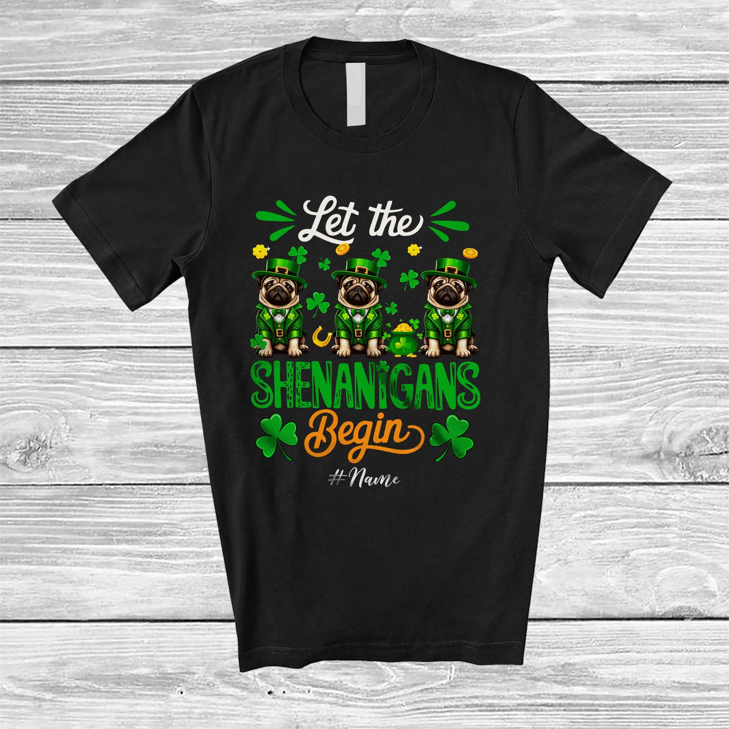 Personalized Shenanigans Begin; Amusing St. Patrick's Day Custom Name Three Pugs Leprechaun T-Shirt. This cotton t-shirt is a durable staple product with a classic fit. One of the most popular items, it has a relaxed style made for everyday and casual wear.