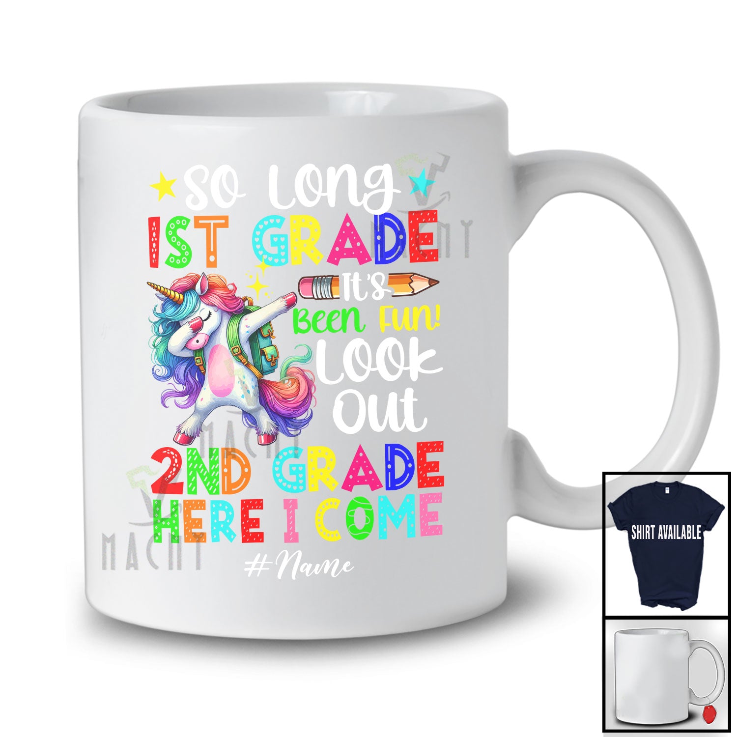 Personalized So Long 1st Grade Look Out 2nd Grade; Lovely Last Day Of School Custom Name Unicorn T-Shirt. This cotton t-shirt is a durable staple product with a classic fit. One of the most popular items, it has a relaxed style made for everyday and casual wear.