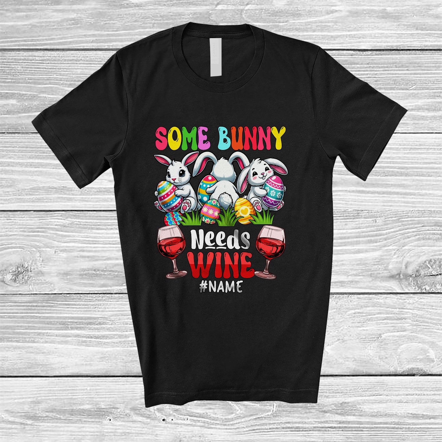 • Personalized Some Bunny Needs Wine; Adorable Easter Three Bunnies; Eggs Hunt Groovy T-Shirt. This cotton t-shirt is a durable staple product with a classic fit. One of the most popular items, it has a relaxed style made for everyday and casual wear.