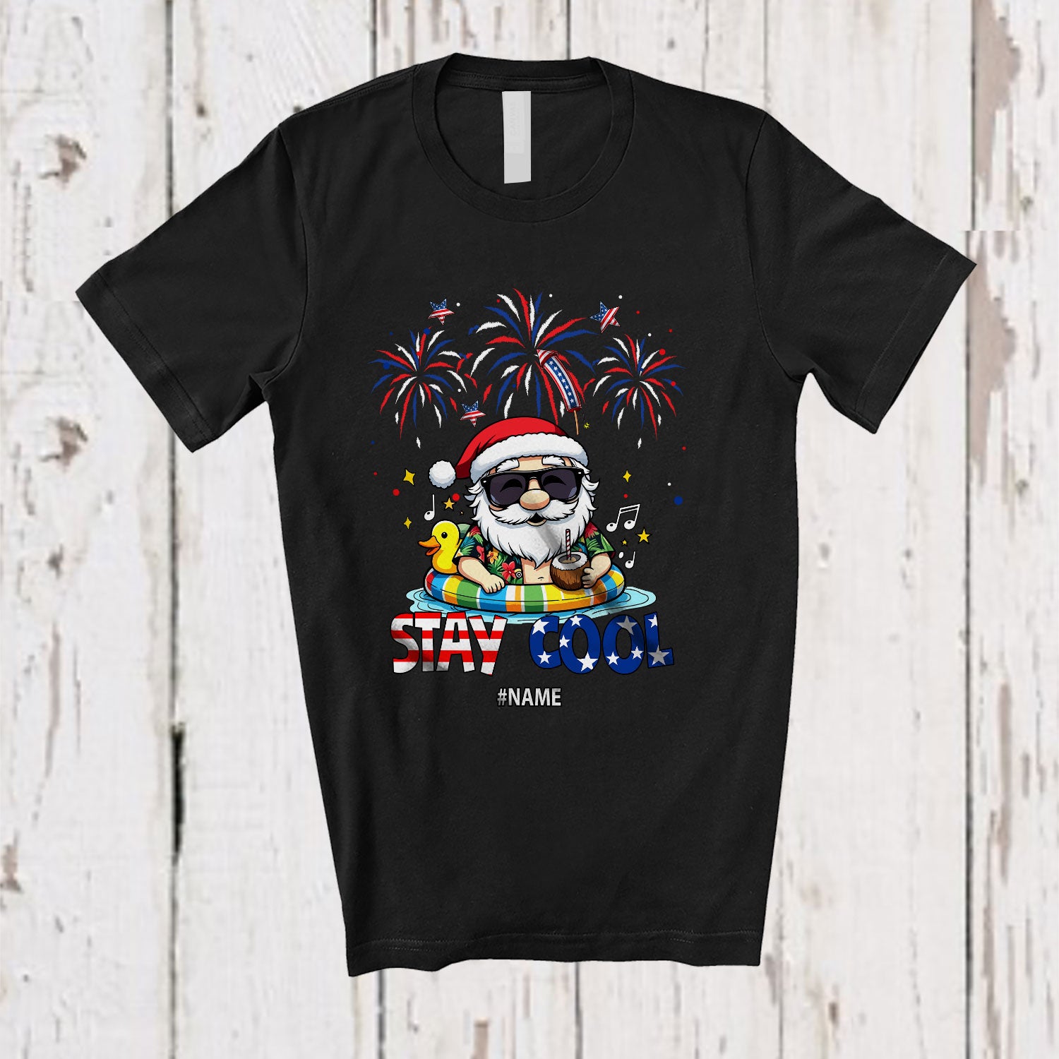 • Personalized Stay Cool; Proud 4th Of July Custom Name Hawaiian Santa Sunglasses Beach; Patriotic T-Shirt. This cotton t-shirt is a durable staple product with a classic fit. One of the most popular items, it has a relaxed style made for everyday and casual wear.
