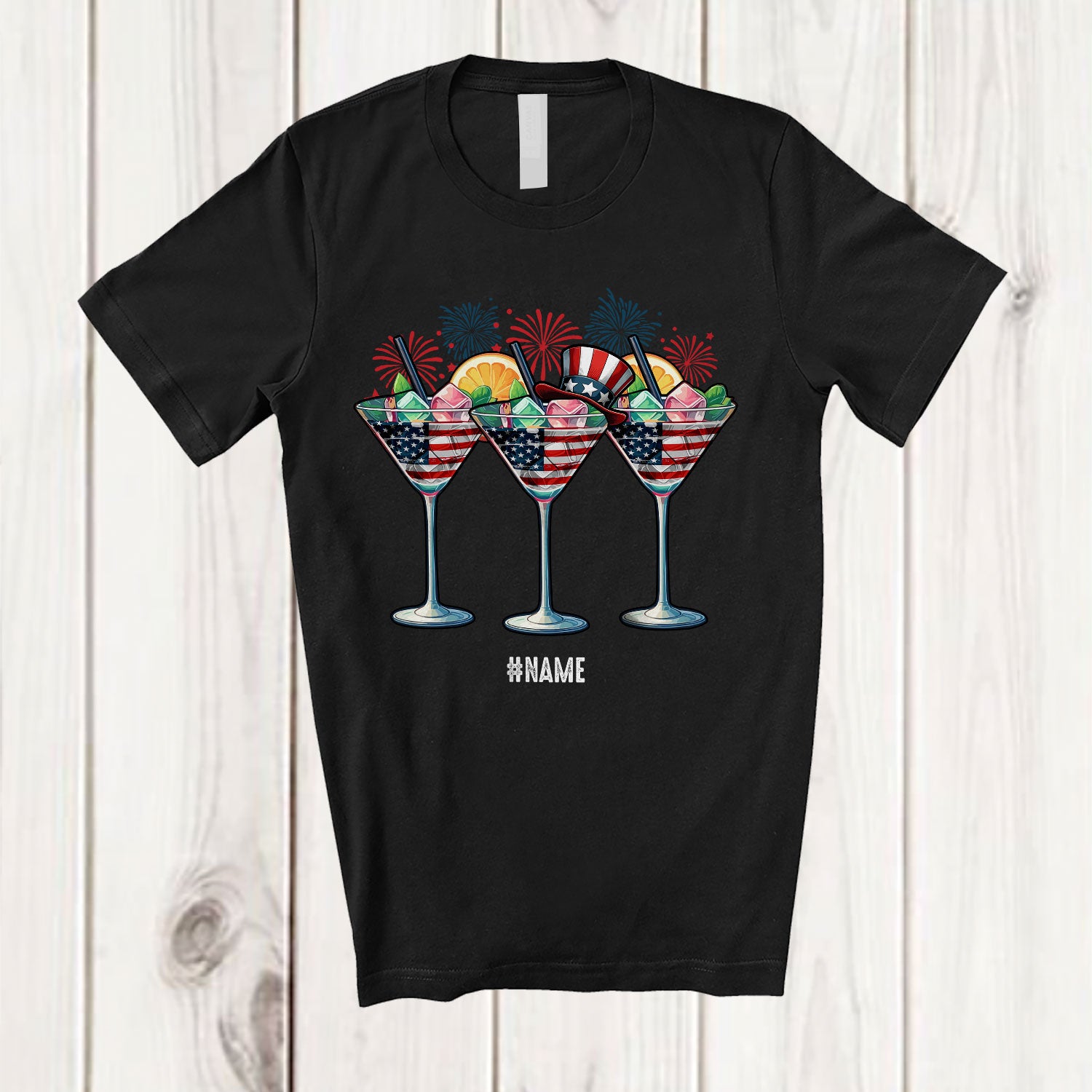 Personalized Three Cocktail Glasses Fireworks; Joyful 4th Of July Custom Name Drinking Patriotic T-Shirt