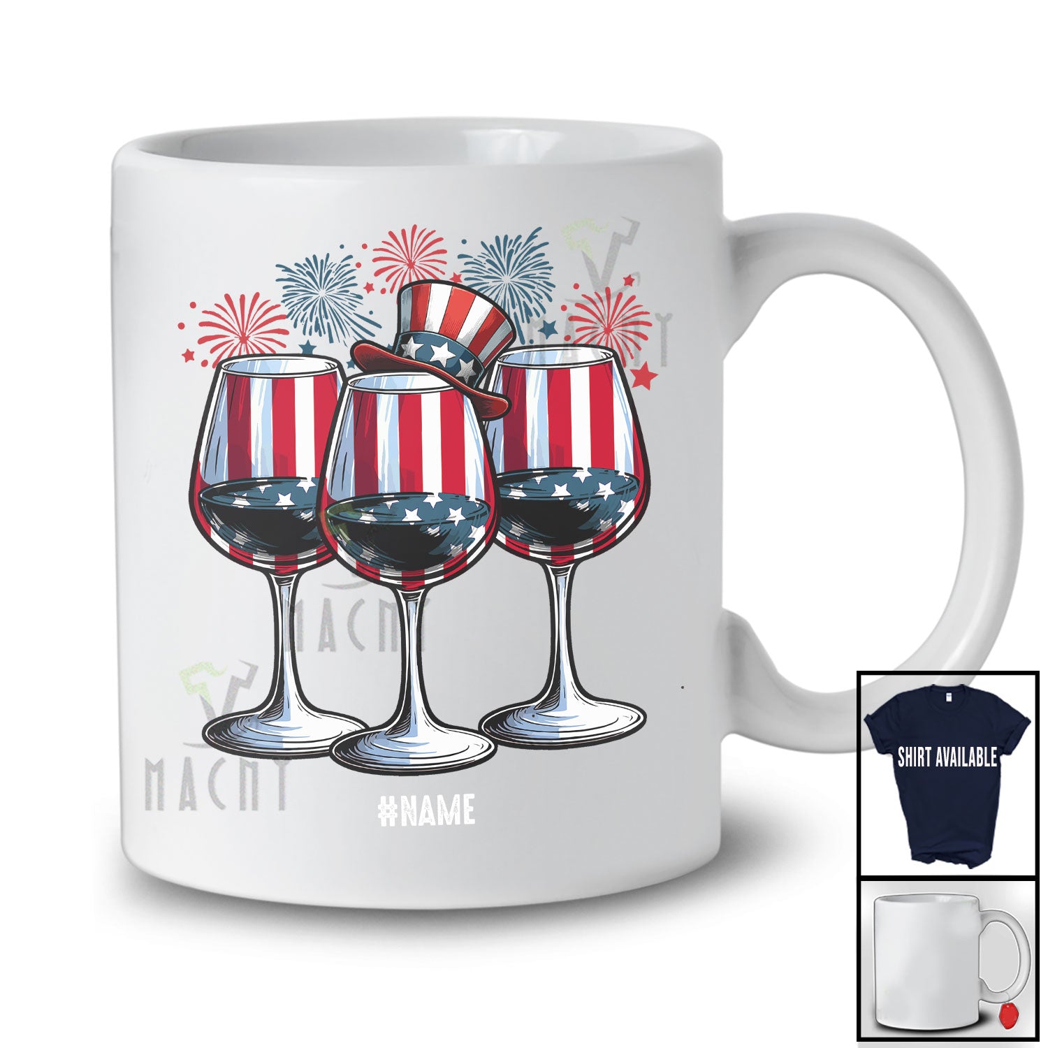 Personalized Three Wine Glasses Fireworks; Joyful 4th Of July Custom Name Drinking Patriotic T-Shirt. This cotton t-shirt is a durable staple product with a classic fit. One of the most popular items, it has a relaxed style made for everyday and casual wear.