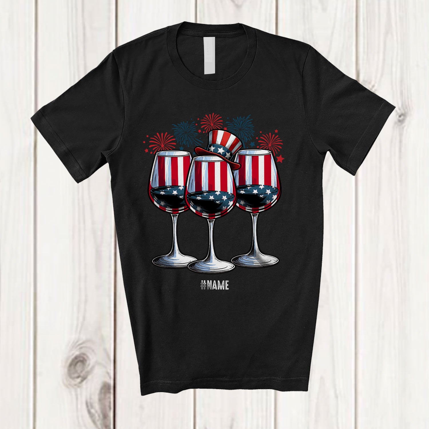 Personalized Three Wine Glasses Fireworks; Joyful 4th Of July Custom Name Drinking Patriotic T-Shirt