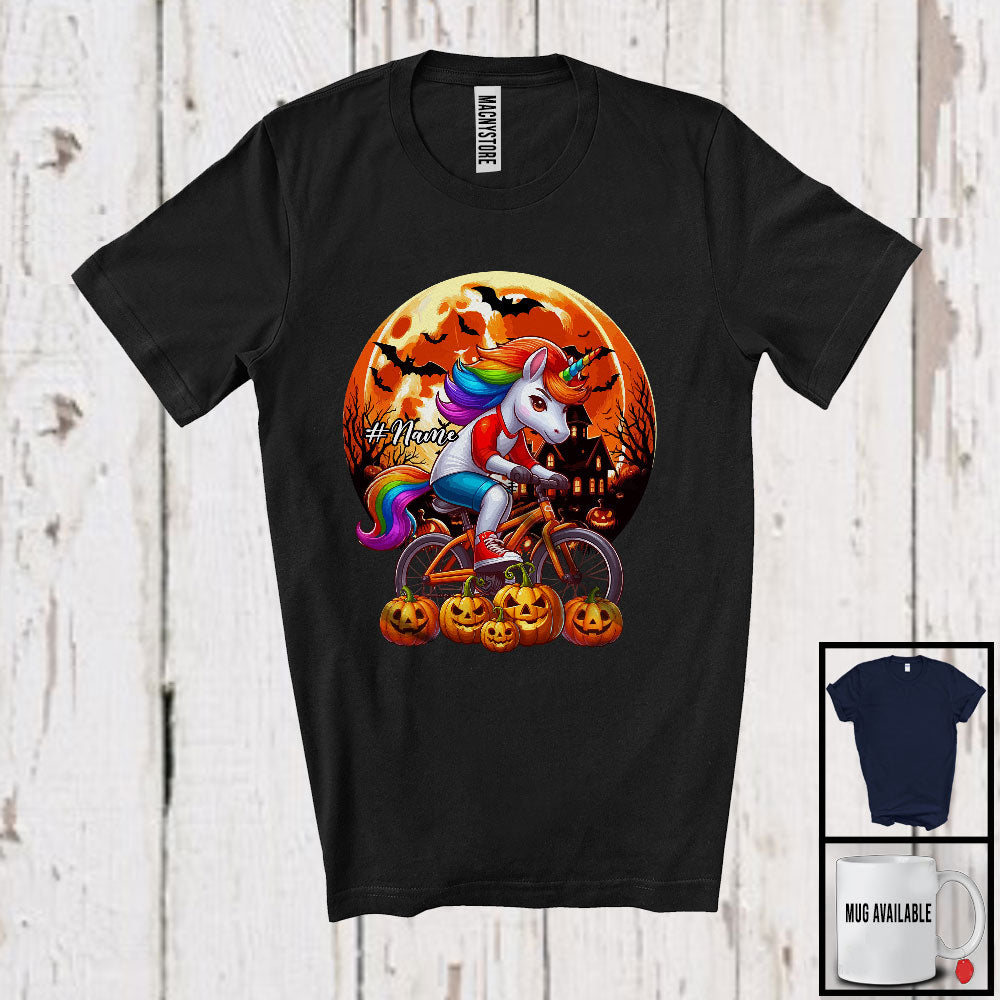 new MacnyStore - Personalized Unicorn Riding Bicycle; Creepy Halloween Moon Custom Name Unicorn T-Shirt – Macnystore