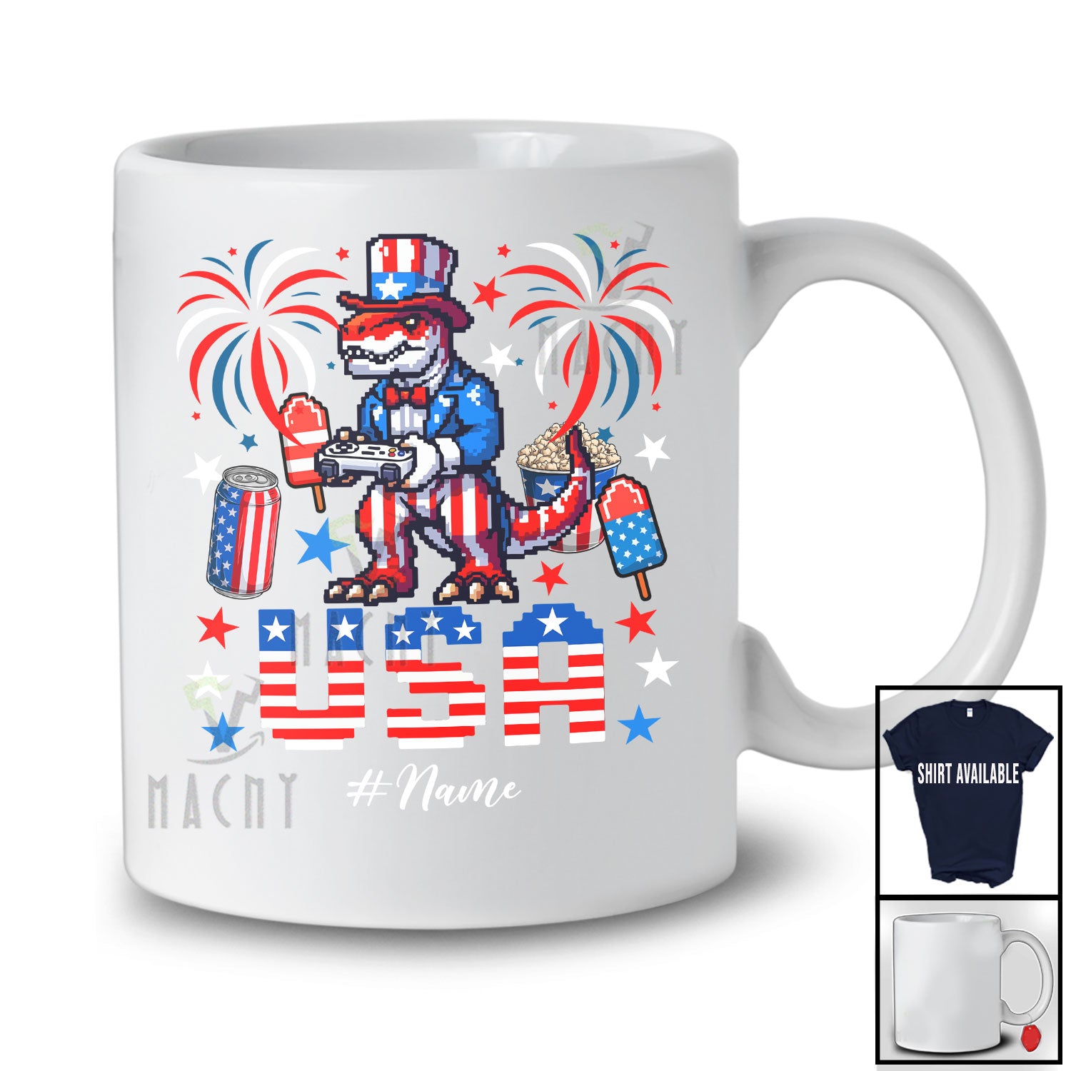• Personalized USA; Amazing 4th Of July Custom Name T-Rex Gamer Video Game Controller; Patriotic T-Shirt. This cotton t-shirt is a durable staple product with a classic fit. One of the most popular items, it has a relaxed style made for everyday and casual wear.